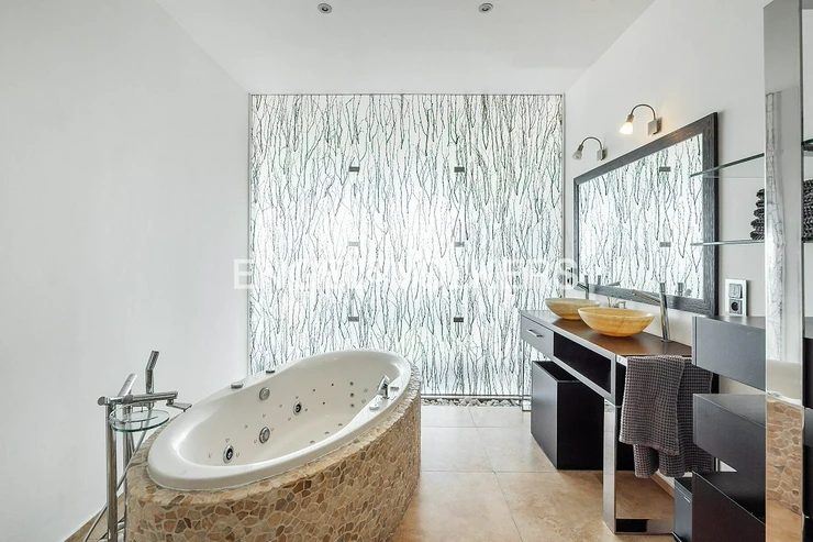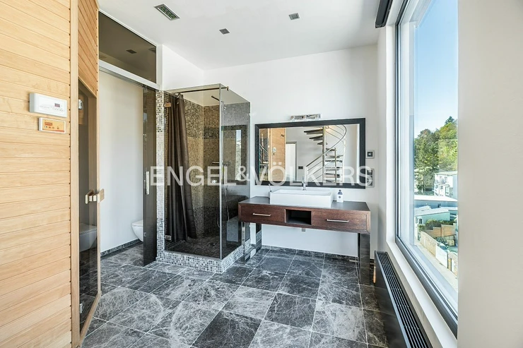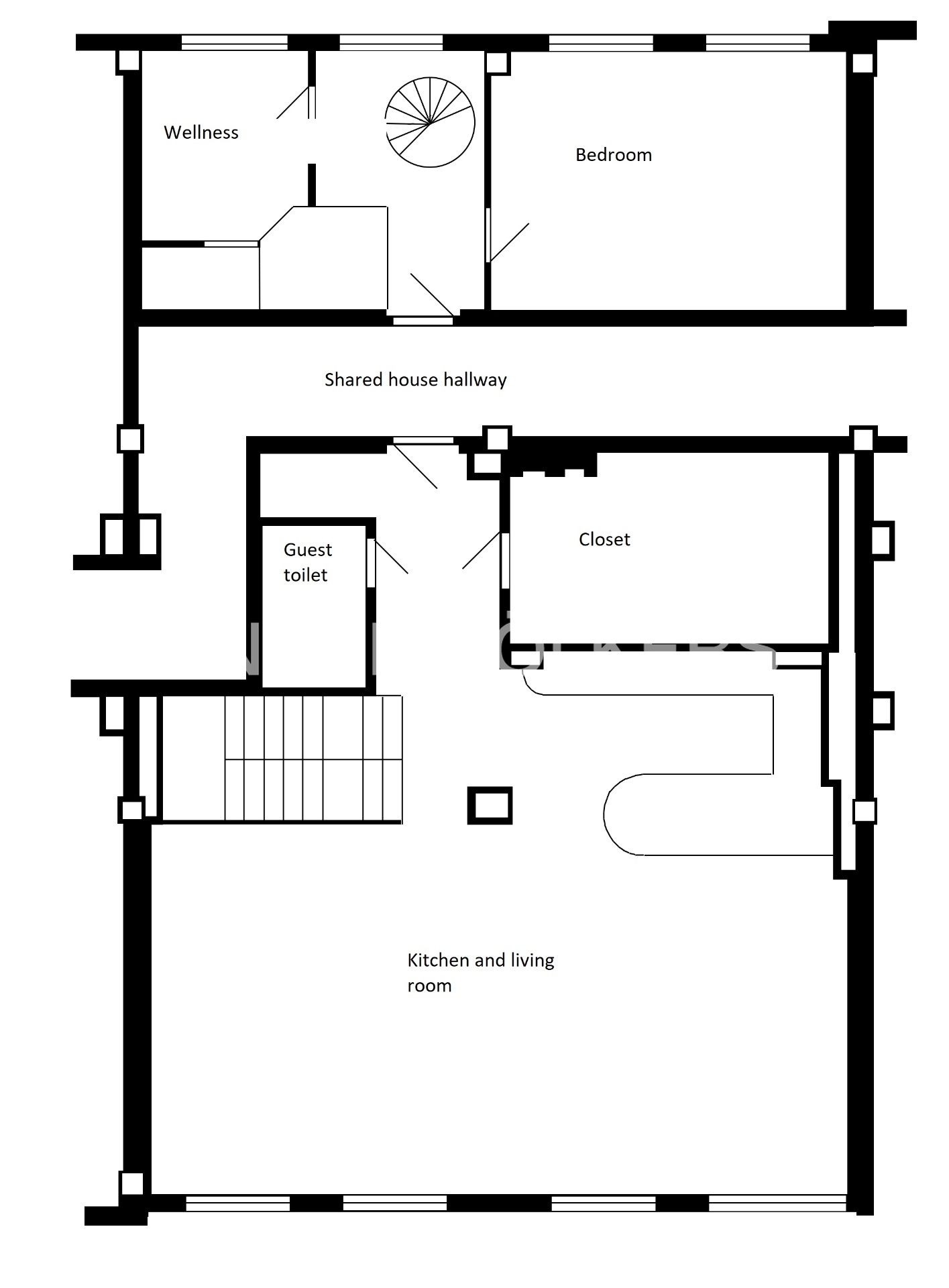 On the upper floor there is one bedroom, an open office (gallery), a bathroom and an open dressing room with built-in wardrobes.