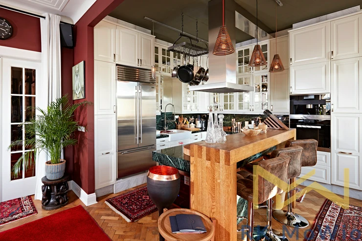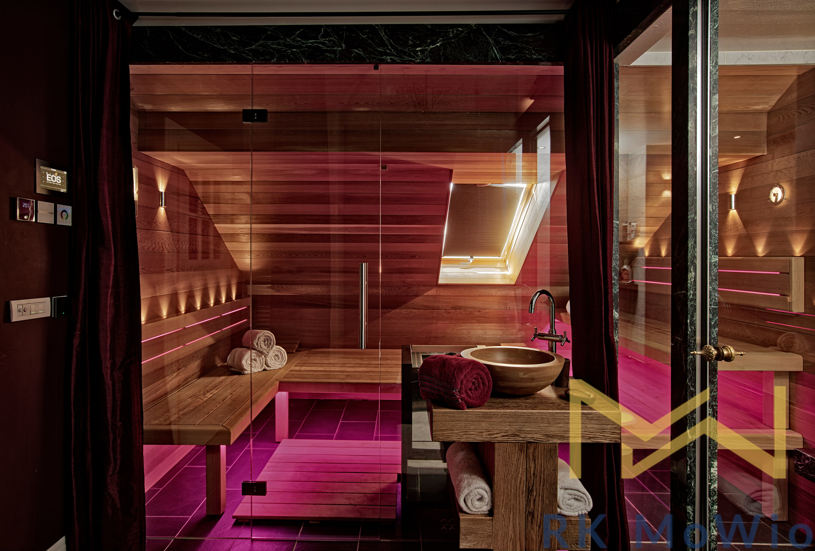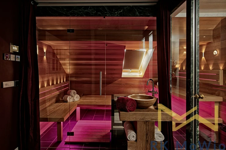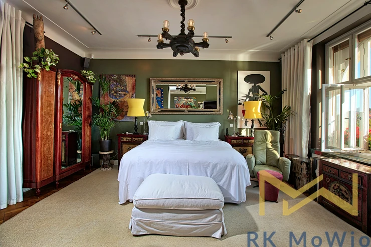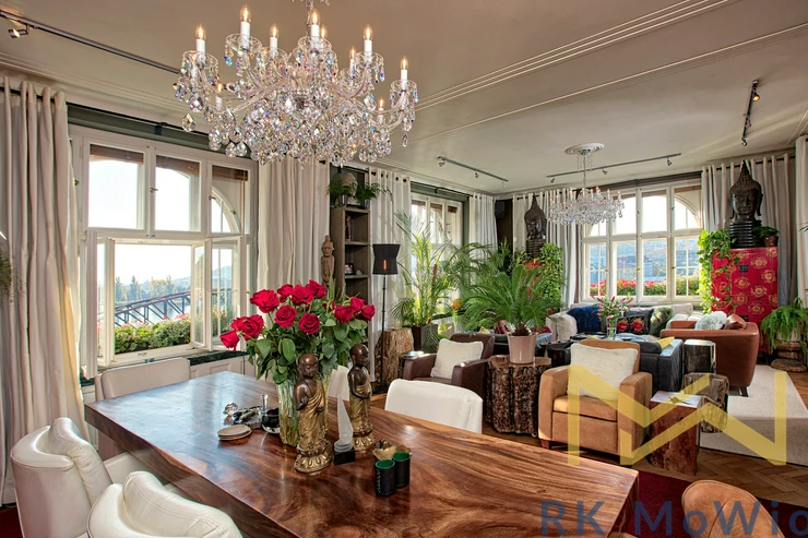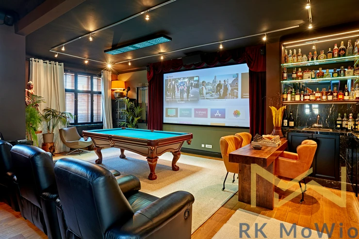 The apartment has an entrance hall, a grand living room with a bay window and a tiled stove, 3 kitchens, 4 bedrooms, and a dining area. The living room leads to the main bathroom (with a bathtub, sink, and toilet). The apartment also offers a backlit sauna, private cinema, terrace (200 m2) with a hot tub, two additional bathrooms, a library, study, and relaxation room with a bar. Apartment amenities: kitchen including refrigerator with freezer, gas hob, extractor hood, dishwasher, electric and microwave ovens; built-in wardrobes, high-speed internet connection, security door, alarm, pool table, exotic wood floors and tiles.