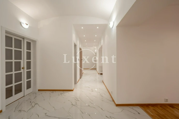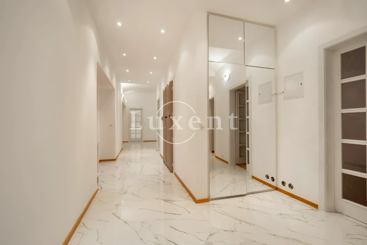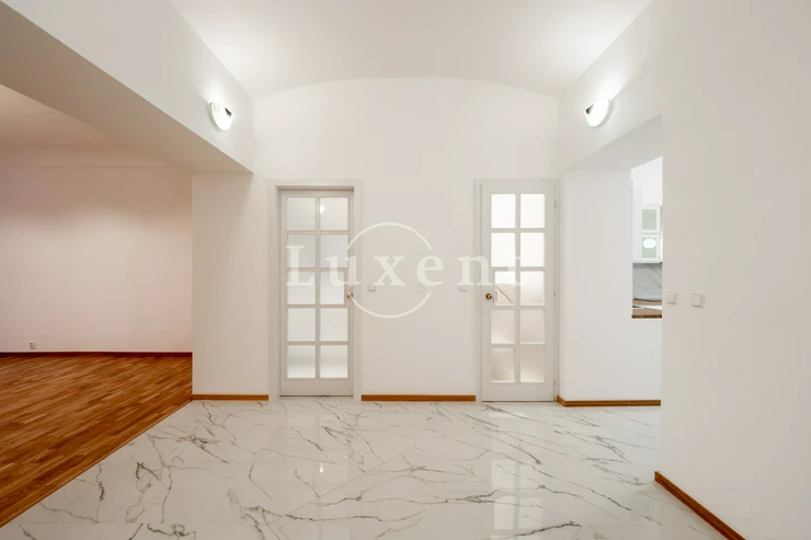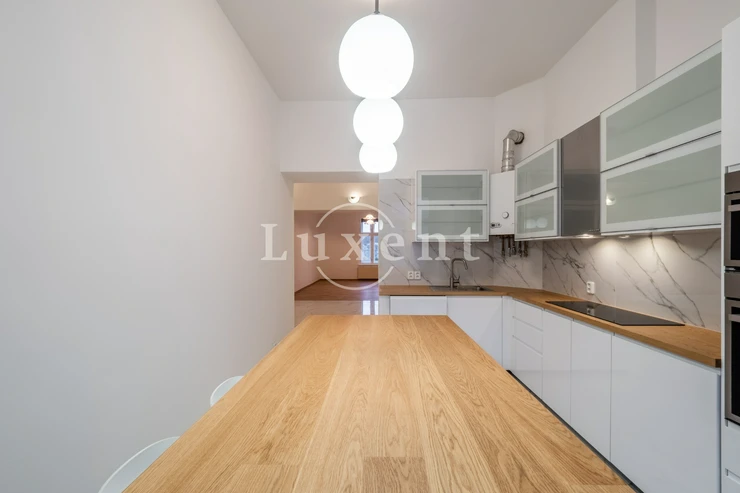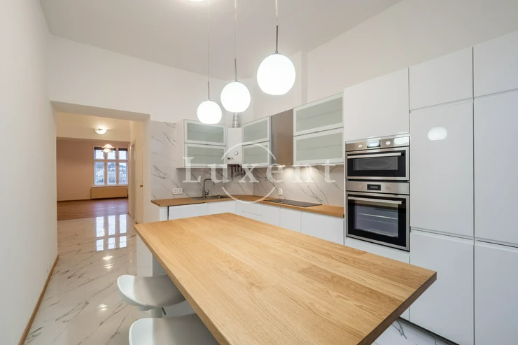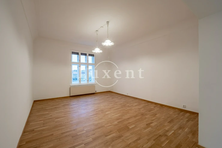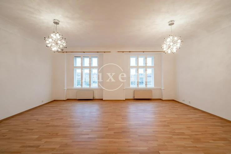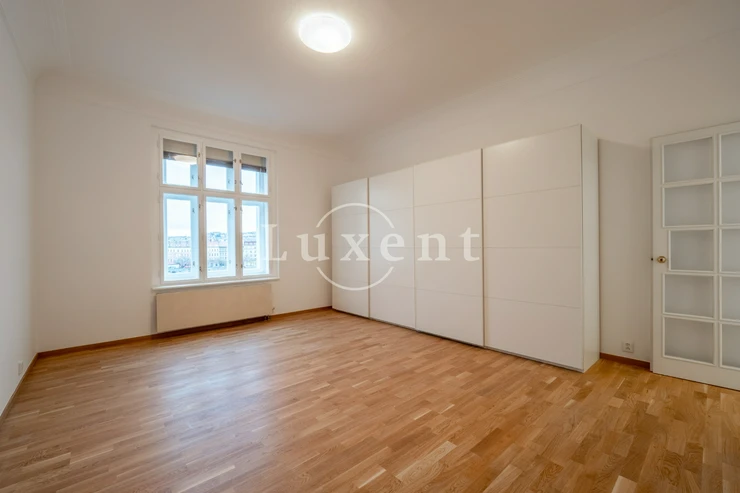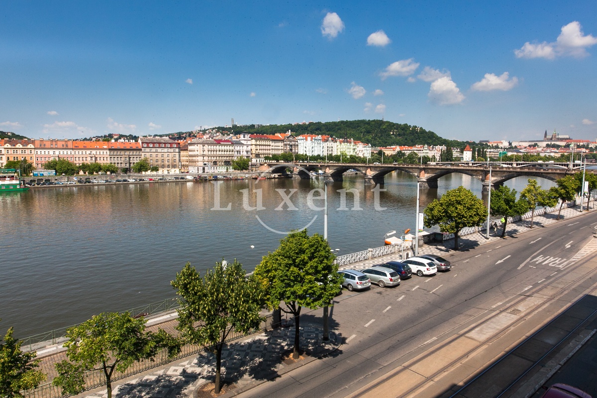 We offer for rent an unfurnished but spacious 6+1 apartment with a living area of 200 sqm on Rašínovo nábřeží with a beautiful view of the Vltava River and its Malostranský bank. The apartment is located in a completely renovated Art Nouveau building with an elevator and a number of extra services such as 24-hour reception, swimming pool (6x11 m), sauna, jacuzzi, fitness and games room with billiards.