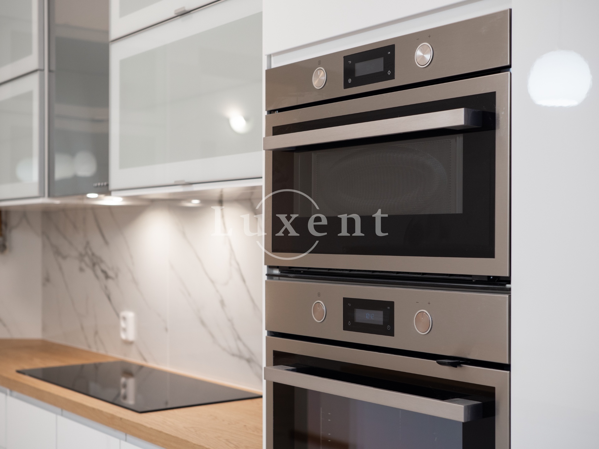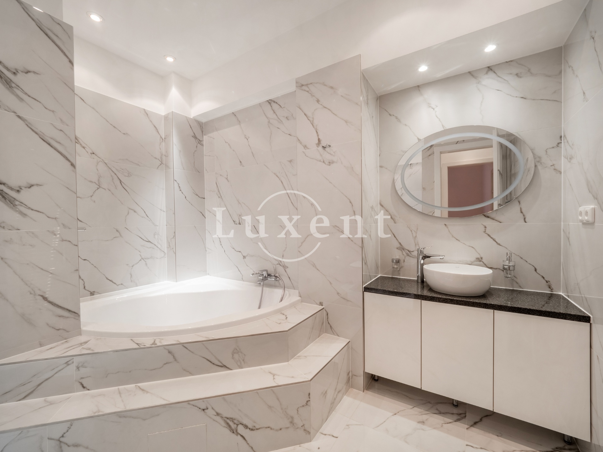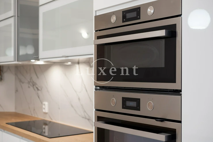 The layout of the apartment includes four bedrooms, living room, kitchen, dining room, entrance hall, storage room and two bathrooms with toilet, the larger of which has a bathtub and the smaller one a shower. The fully equipped kitchen has a built-in washing machine in addition to all appliances. The appartment is completely reconstructed.