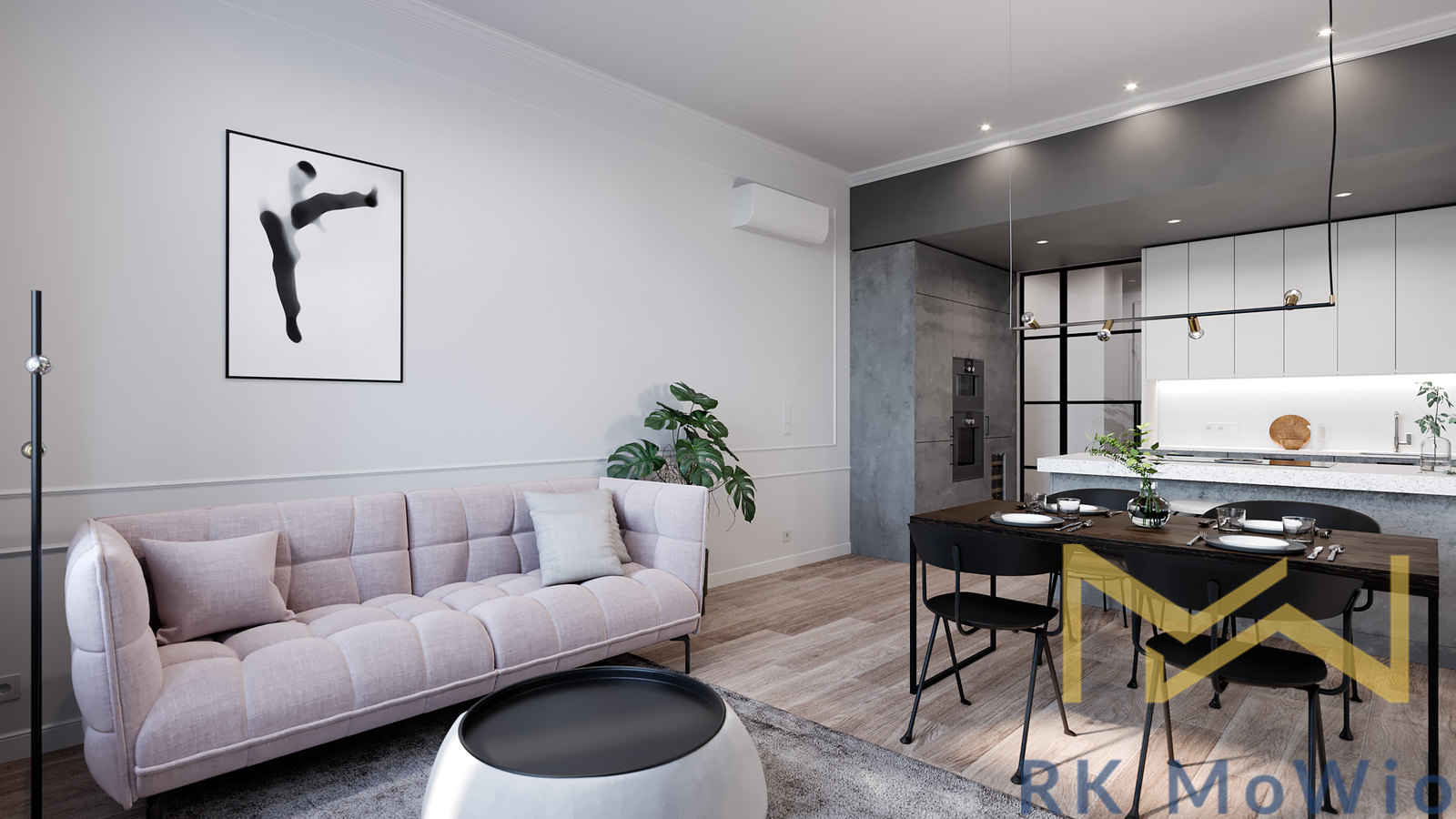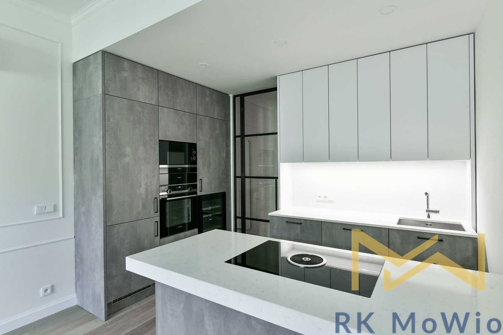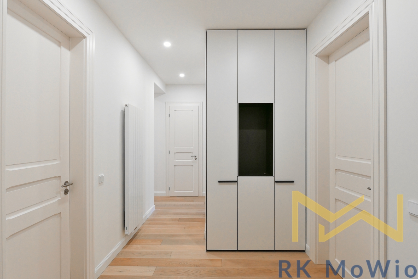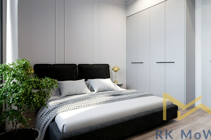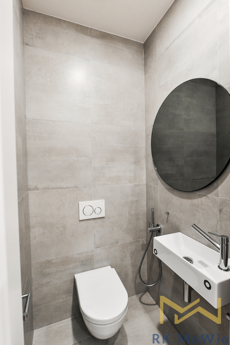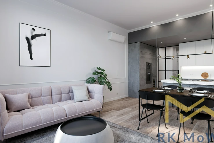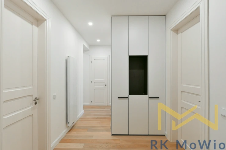 The apartment consists of an entrance hall, a spacious living room, a kitchen with an island and dining area, a master bedroom with a walk-through dressing room and en-suite bathroom (shower, washbasin, bidet, and toilet), a second bedroom/children's room, and a separate bathroom (with shower, washbasin, and toilet). The apartment is equipped with a kitchen unit including a fridge with freezer, ceramic hob, built-in electric and microwave oven; built-in wardrobes, a washer-dryer combo, air conditioning, wine fridge, oak wood floors, tiles, and new double-glazed windows. One parking space is included.