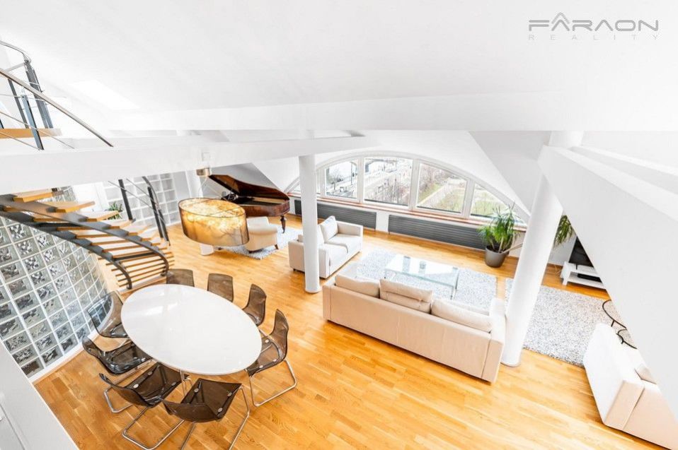 For rent, luxury two-story duplex apartment 5+kk, 250 m2 with a terrace and a winter garden, with a wonderful view of the Vltava River, Prague Castle and Petřín, on the 6th and 7th floors of a completely renovated historic Art Nouveau building with an elevator near the waterfront, a few minutes from Palackého náměstí and Karlova náměstí, in Dřevná Street, Nové Město, Prague 2.