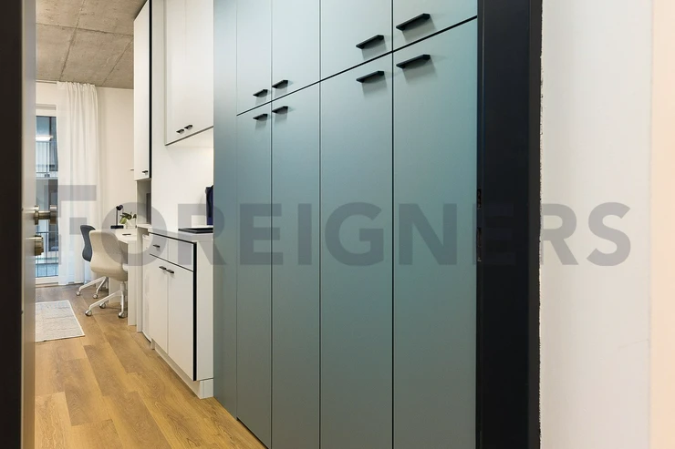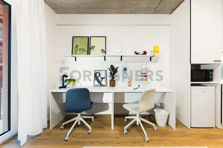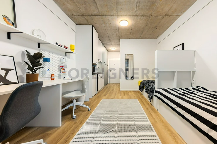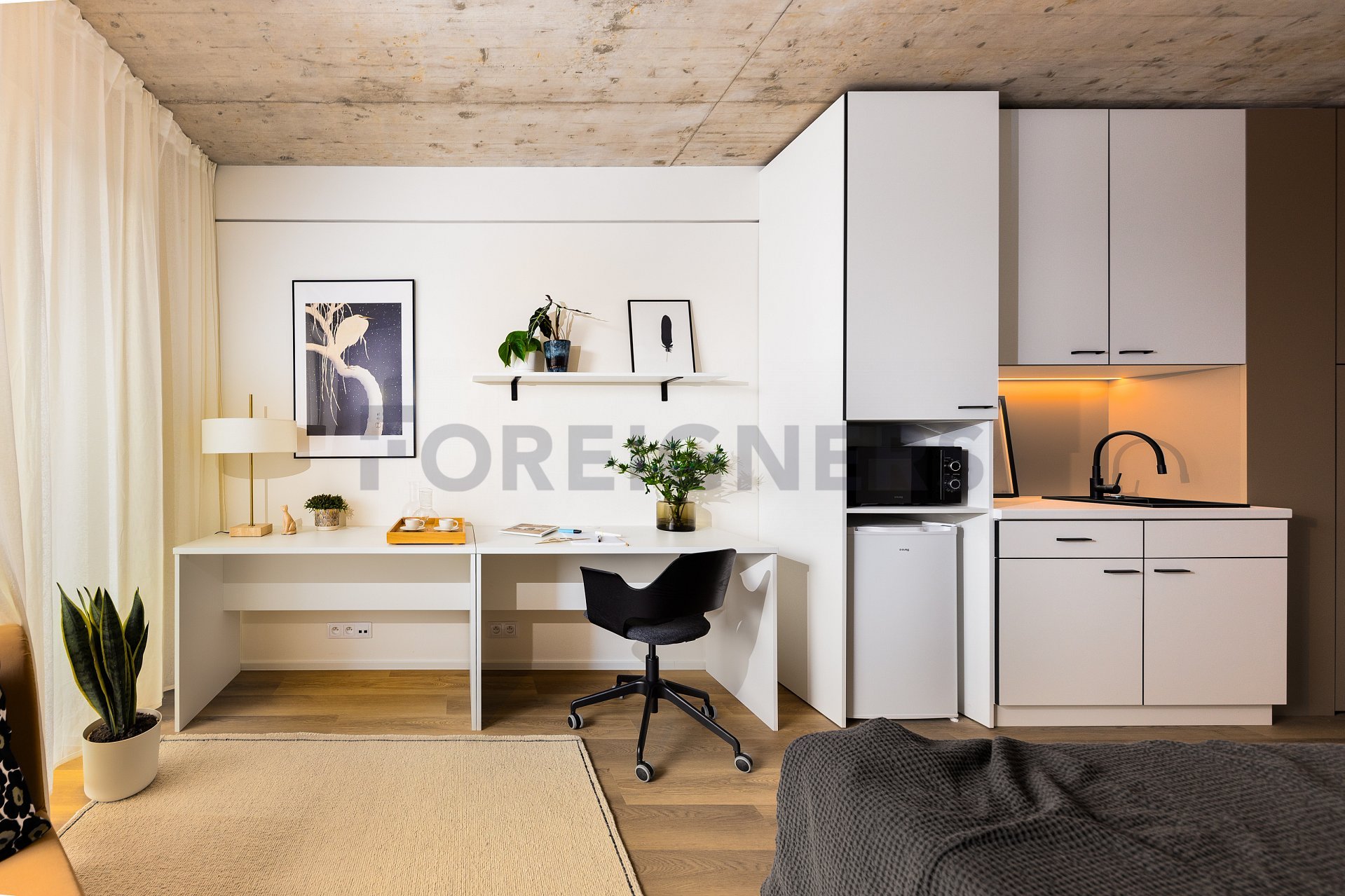 - Fully furnished: kitchen with appliances, bed, work desk, storage space