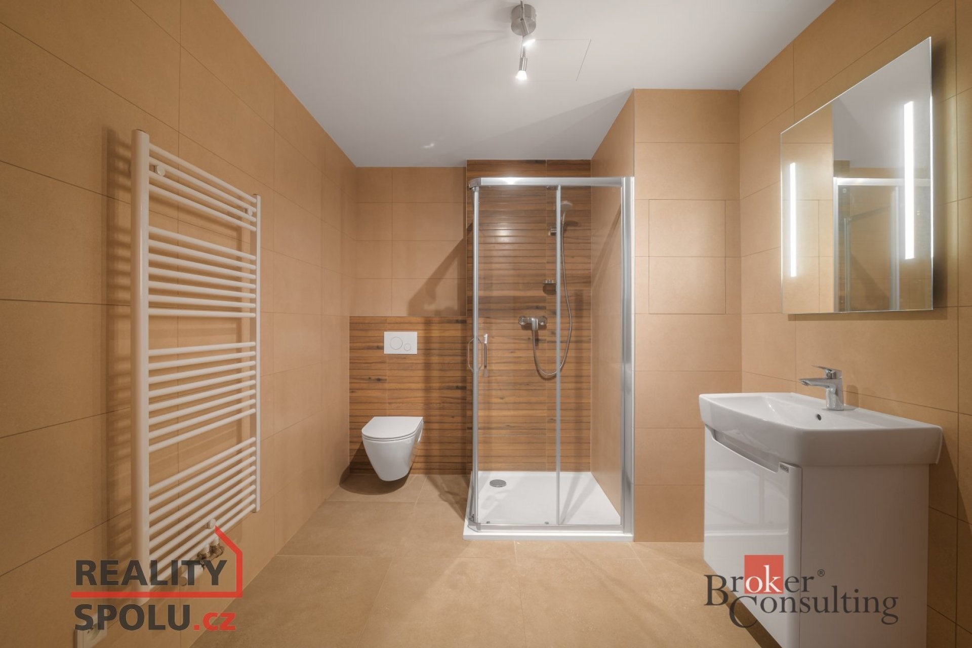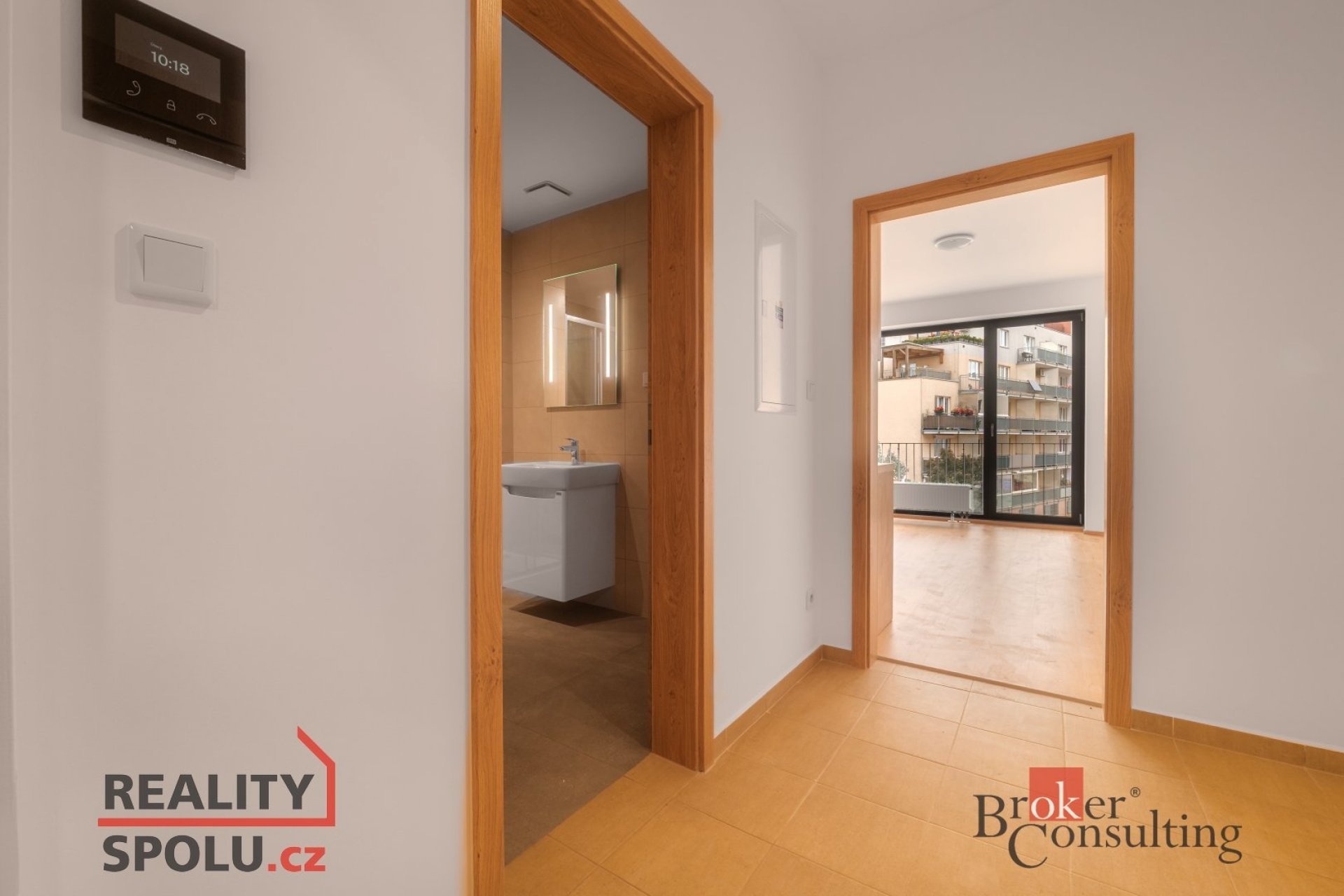 Byt je vybaven kuchyňskou linkou se spotřebiči (trouba, varná deska, lednice a myčka). Koupelna disponuje sprchovým koutem, umyvadlem a WC.