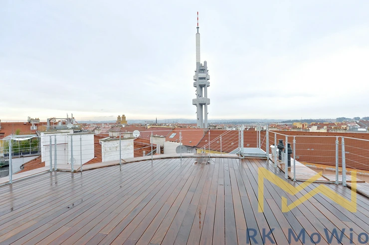 This unique apartment consists of an entrance hall, an airy living room with a kitchen and dining area, one bedroom with built-in wardrobes, one bathroom (with shower and washbasin), and a separate toilet. The highlight of the apartment is a spacious terrace accessible from the living room, with stairs leading to a rooftop terrace offering panoramic views. Equipment includes: a fitted kitchen with fridge/freezer, ceramic hob, extractor hood, dishwasher, and electric oven; built-in wardrobes, washer, dryer, wine fridge, air conditioning, high-speed internet connection, oak wood floors, and new double-glazed windows. Possibility to rent a parking space for an extra fee of 7,550 CZK/month + 21% VAT (1,585.5 CZK), total amount 9,135.5 CZK.