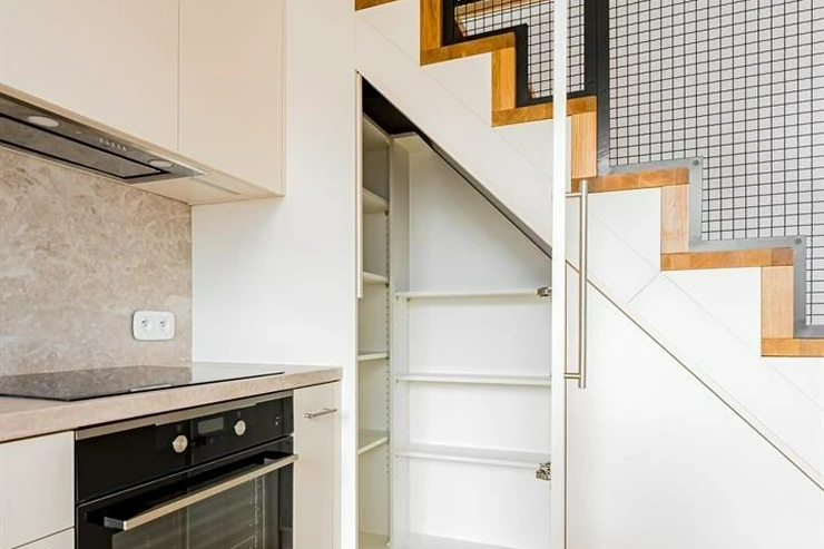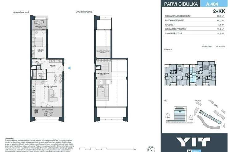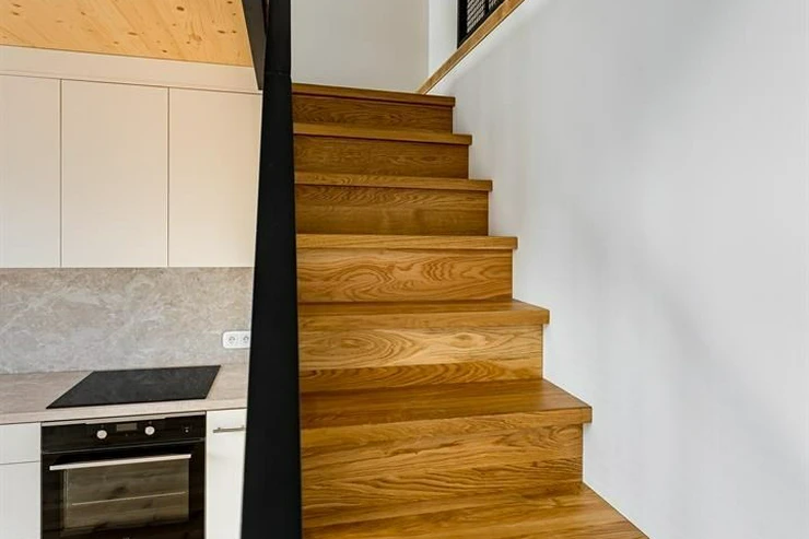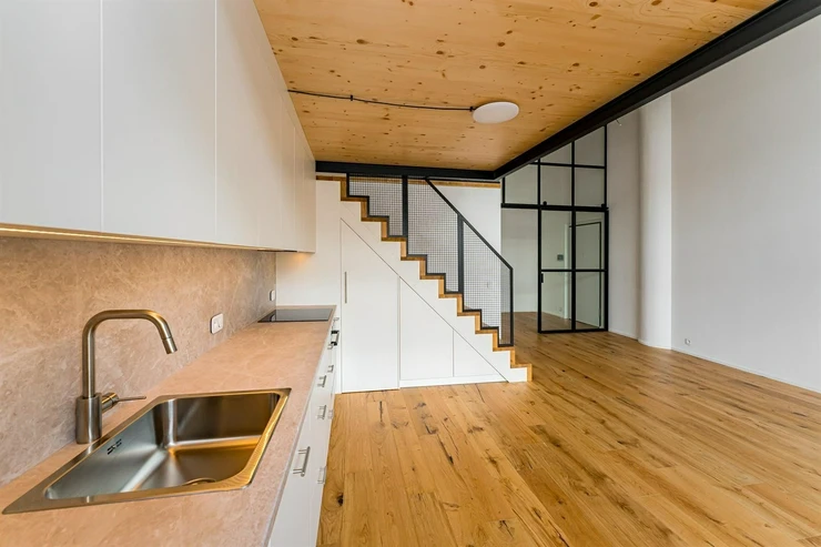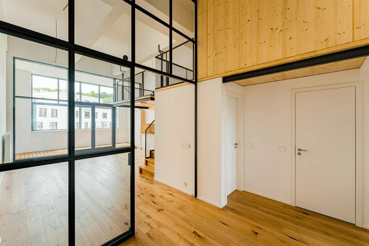 The industrial character of the building and the original features have been preserved. The layout of this loft apartment 3+kk with an area of 97.4 m2 consists of an entrance hall, a spacious living room with an equipped kitchen, open gallery, and winter garden/covered loggia (9.8 m2). Dominating the room are high ceilings and industrial metal doors with glass panes. There is a custom-made new kitchen unit, appliances – dishwasher, fridge with freezer, and a cleverly designed storage pantry under the stairs. The gallery can serve as a bedroom or study. There is also a separate bedroom with a loft and winter garden/covered loggia (4.8 m2), a bathroom with a bathtub, and a separate toilet.