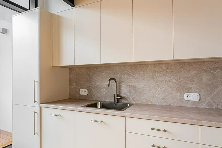 High ceilings (4.7-5m), wooden floors, frameless interior doors, Laufen sanitary ware, interesting details, and industrial elements complete the atmosphere of this attractive living space. Security entrance doors and smart home features are standard. There is one parking space included in the rent.