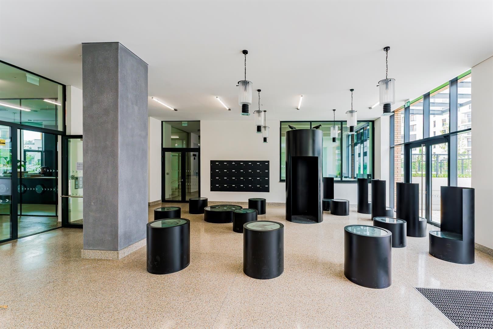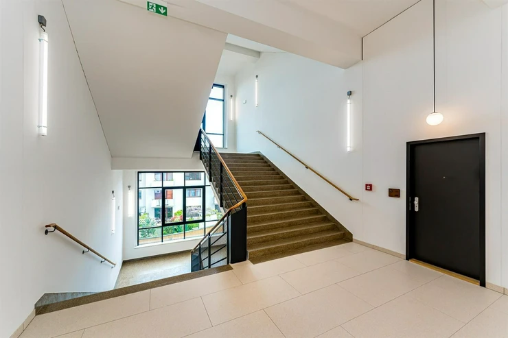 In the area, there is a green park with a water feature, a children's playground, benches. The complex also includes a pram room, facilities for washing bicycles and dogs, a shared workshop, and a space prepared for a café, which is expected to open soon. Small groceries are within walking distance.