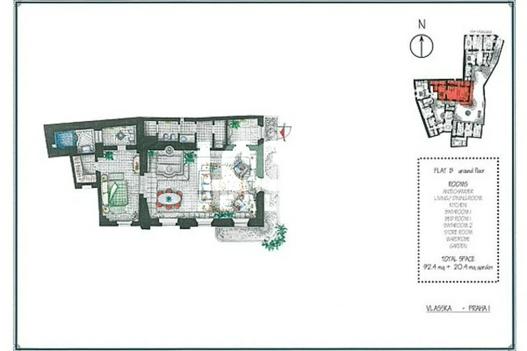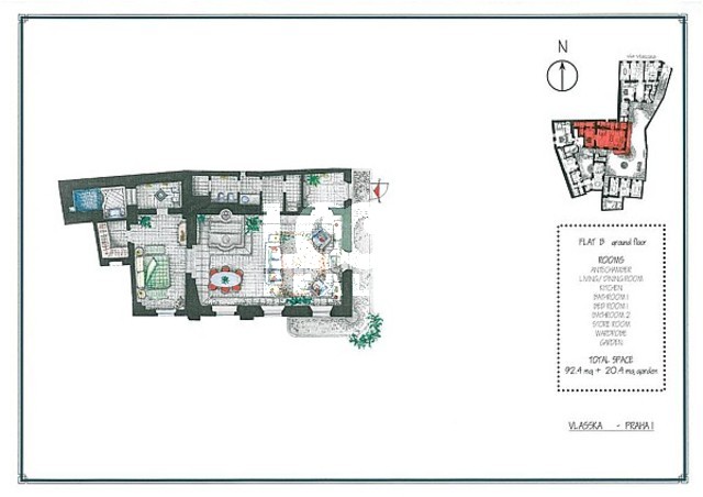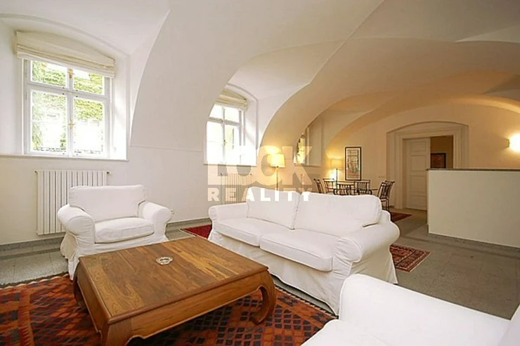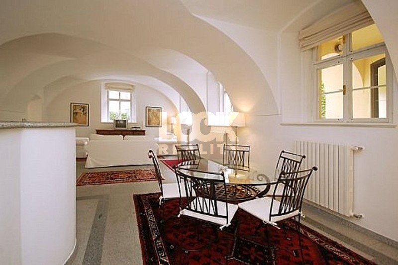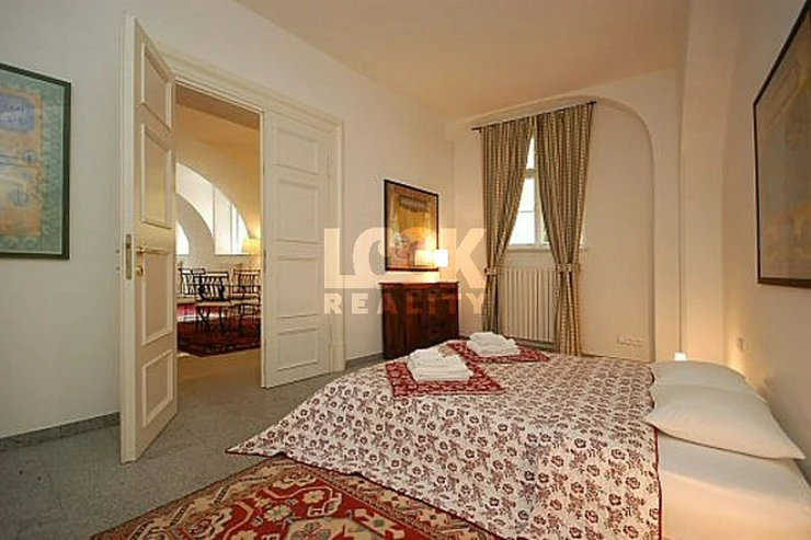 Fully furnished apartment 2+kk is located in the center. Rent unique apartment 2+kk with a beautiful luxury furnishings, oriental carpets and Gothic arches. The apartment is located on the ground floor. Entrance through a small private garden situated towards the common courtyard with trees and a fountain. Nice place to relax. The apartment has a living room with kitchen, bedroom, 2 luxury bathrooms, built-in wardrobe and chamber. The living room has a sofa bed, satellite TV and DVD. In one bathroom is shower and in the other bathroom there is bath, which is located under the floor and equipped with suggestive lighting under water. The bedroom has a built-in wardrobe. Pets are allowed. Near the apartment there is a bus stop Sporkova. All amenities: restaurants, shops, hospitals, libraries, schools, post office. The apartment is located near Lobkovicka garden with beautiful trees, an ideal place to relax. Very nice living in the city center.