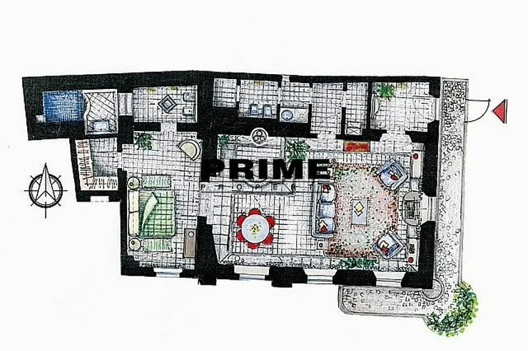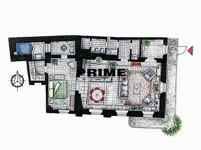The property is South-east facing, has Gothic vaulted ceilings, is accessed via a small private garden terrace, has views of the green courtyard with a fountain and comprises: an entrance hallway, a 47m2 living room with a dining area and an open, fully fitted kitchen with appliances (electric cooking hobs, microwave oven, fridge, freezer and a dishwasher), a 17m2 bedroom with a walk in closet and an en suite bathroom (large mosaic floor level bathtub, sink, toilet and a bidet), a second bathroom (large shower cubicle, sink, toilet and a bidet) and a small storage room.