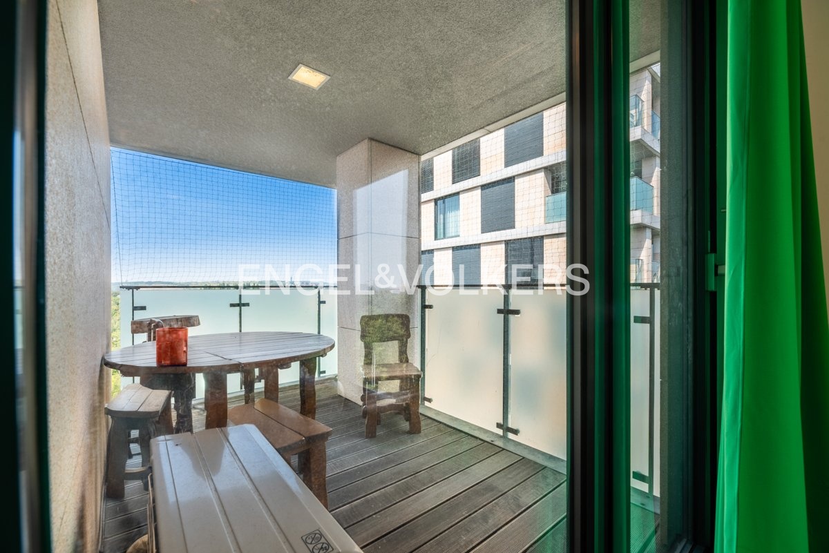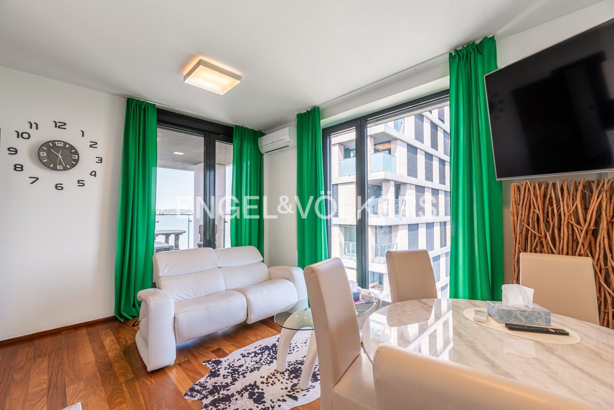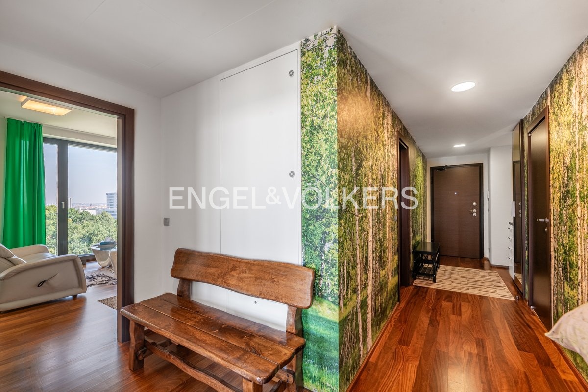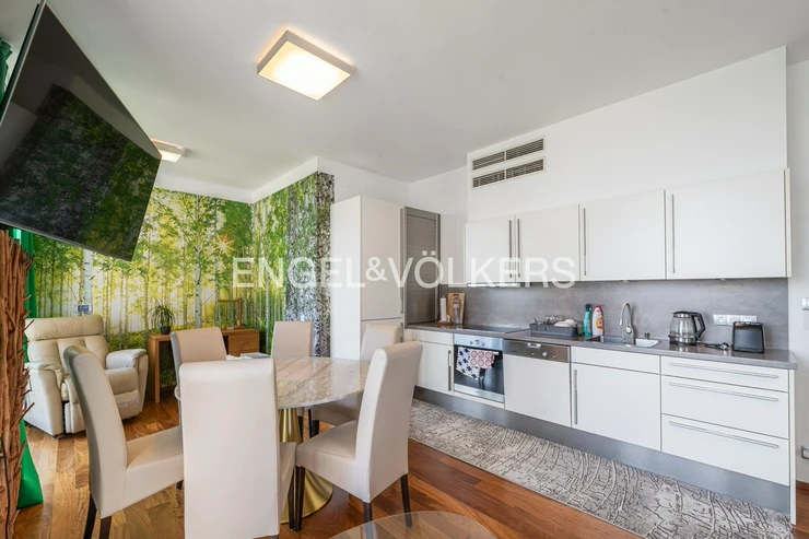 The apartment is equipped with a modern kitchen unit with MIELE appliances (induction hob, convection oven, dishwasher, refrigerator with freezer). The interior includes quality furniture (see photos), a TV, air conditioning, and built-in wardrobes. The flooring combines wooden floors and large-format tiles.