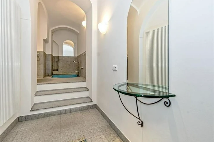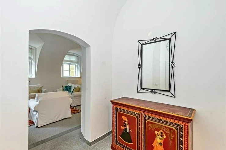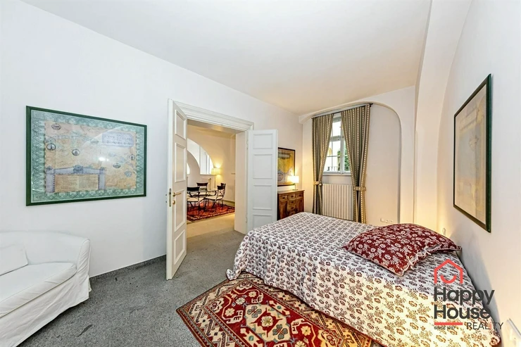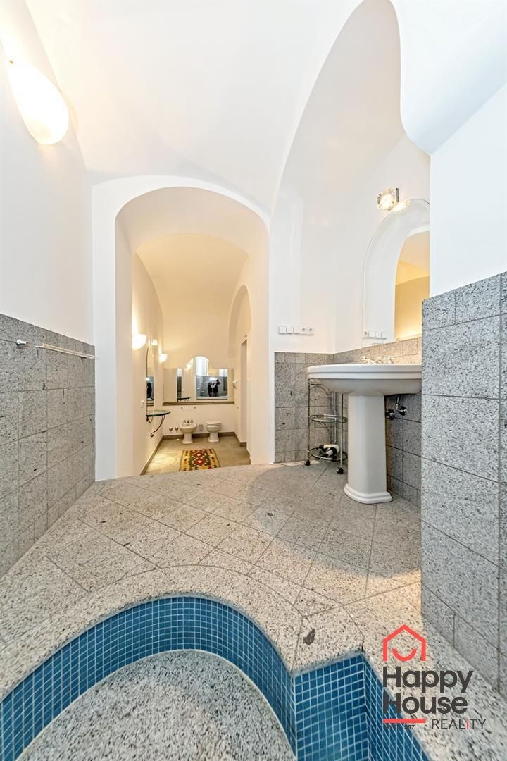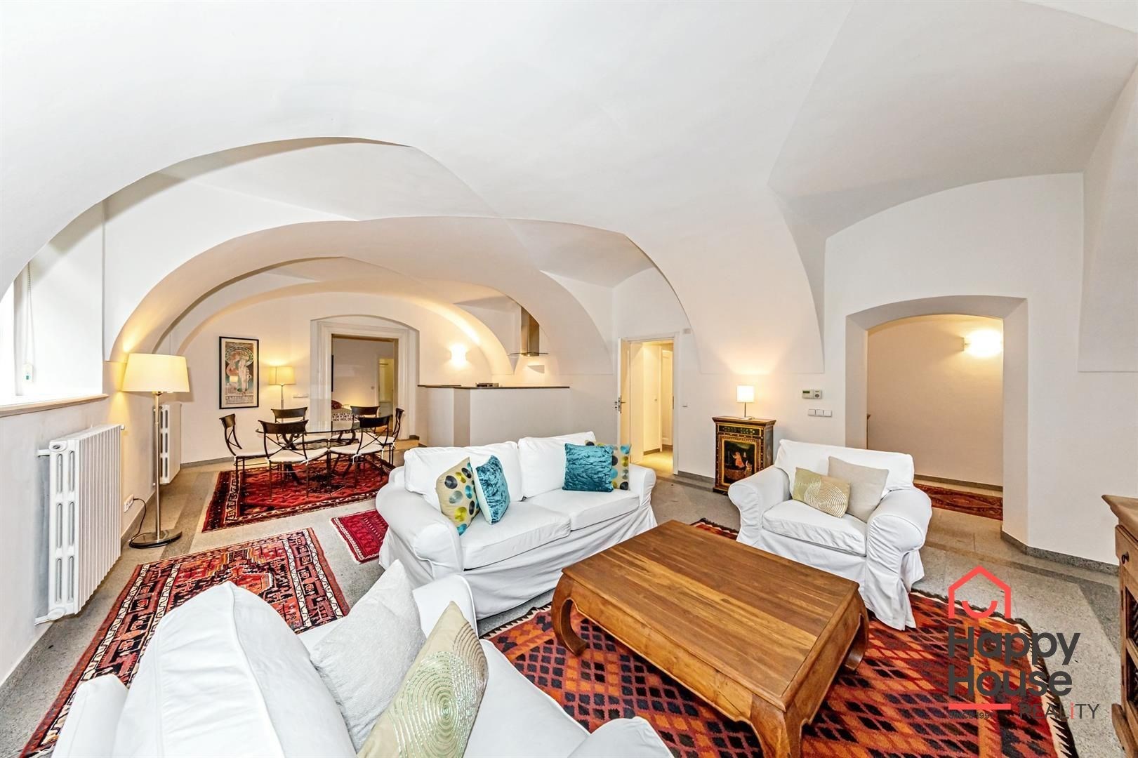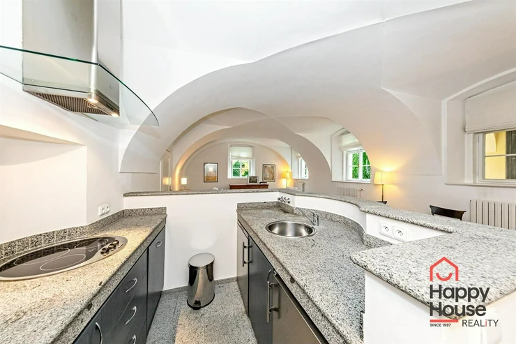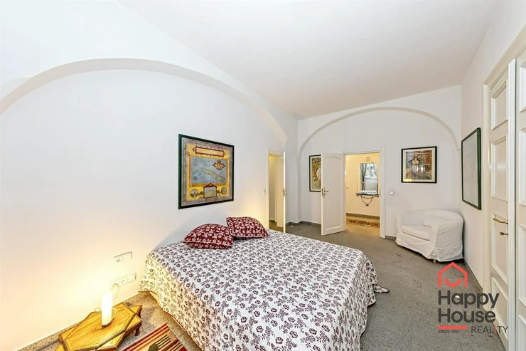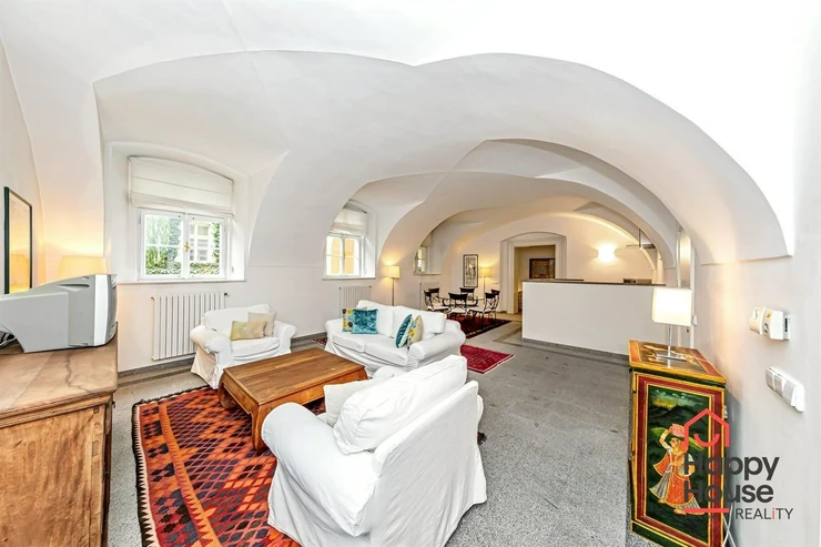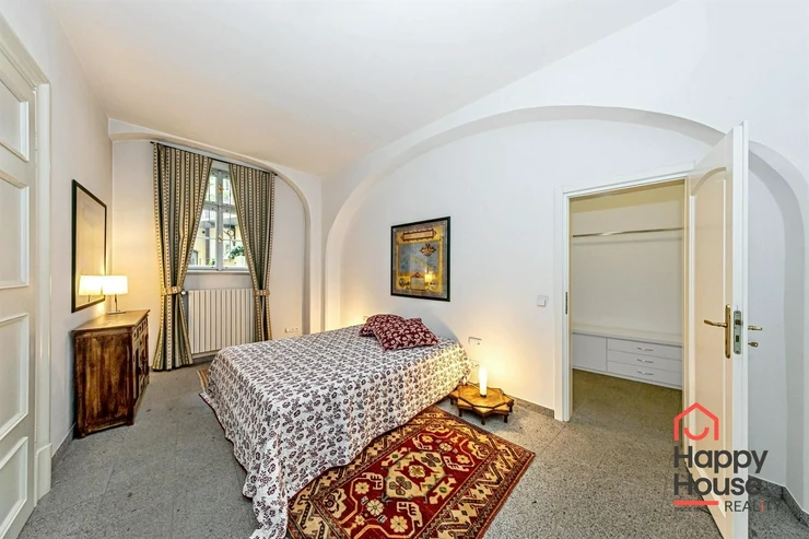 This luxurious one-bedroom apartment is located in a building with a unique atmosphere in the very heart of Malá Strana in Prague 1. This unique apartment has an entrance through a small private garden situated towards a shared courtyard with trees and a fountain with Gothic arches. It is equipped with beautiful furniture, oriental rugs, and has a small private garden. There is an entrance hall, a large living room with a dining area (47 sqm) with Gothic arches, a kitchen/bar, bedroom (17 sqm), two luxurious bathrooms, built-in wardrobe, storage room. One particularly beautiful bathroom with Gothic arches and a 160 cm x 160 cm bathtub with mosaic tiling, which is located below floor level and equipped with suggestive underwater lighting, also has a toilet and bidet. The second one has a large shower, toilet, and bidet. The bedroom features a double bed, a built-in closet, and entrance to the large bathroom. The living room includes a sofa bed for two, satellite TV, and DVD. Remote central heating. The house was renovated from 2000 to 2003 and is part of a complex of buildings historically named "House at the Three Red Hearts". This complex consists of four buildings (with 13 elegant apartments) with terraces, gardens, and courtyard areas with fountains and greenery. Street parking - zones.
