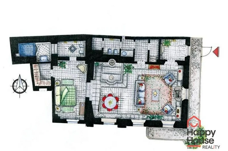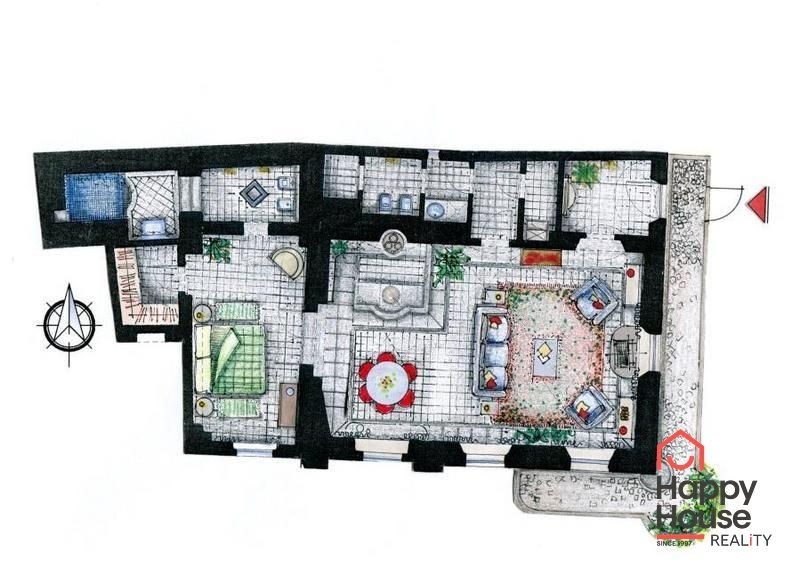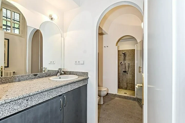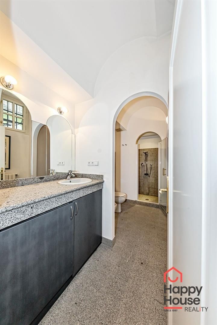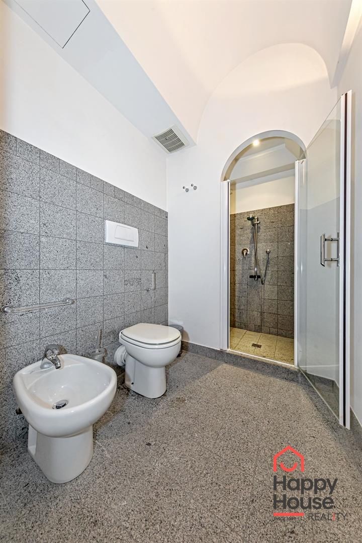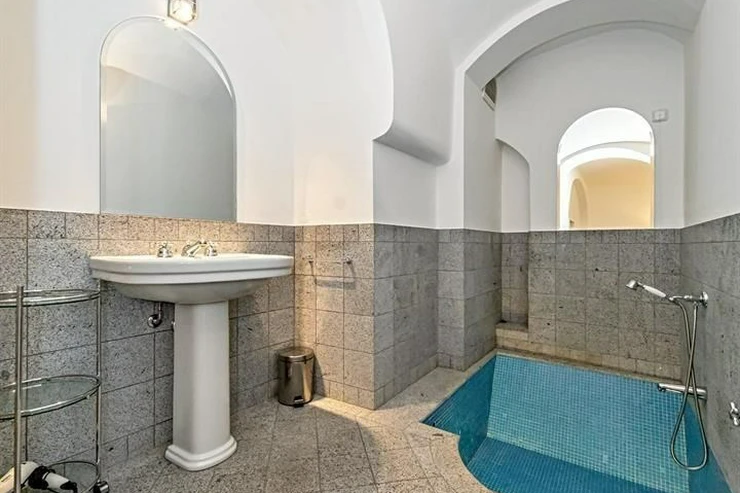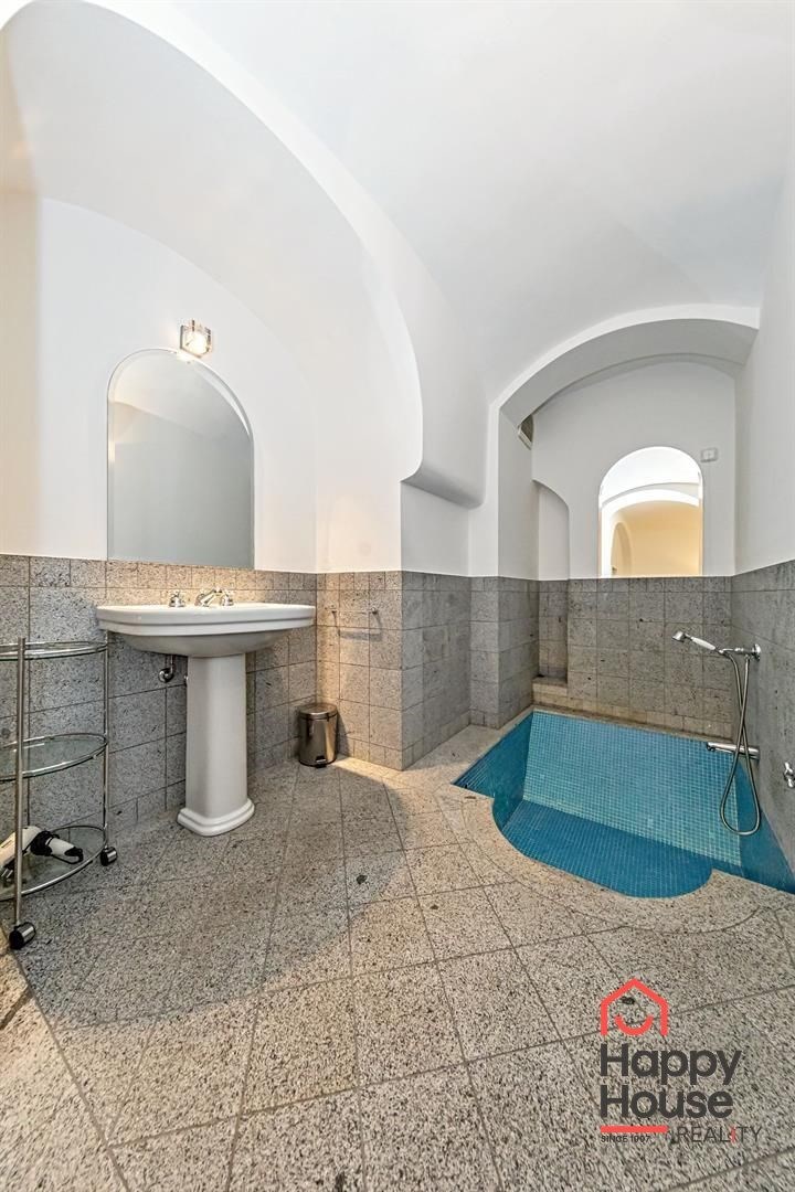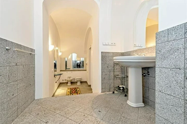 This luxurious one-bedroom apartment is located in a building with a unique atmosphere in the very heart of Malá Strana in Prague 1. This unique apartment has an entrance through a small private garden situated towards a shared courtyard with trees and a fountain with Gothic arches. It is equipped with beautiful furniture, oriental rugs, and has a small private garden. There is an entrance hall, a large living room with a dining area (47 sqm) with Gothic arches, a kitchen/bar, bedroom (17 sqm), two luxurious bathrooms, built-in wardrobe, storage room. One particularly beautiful bathroom with Gothic arches and a 160 cm x 160 cm bathtub with mosaic tiling, which is located below floor level and equipped with suggestive underwater lighting, also has a toilet and bidet. The second one has a large shower, toilet, and bidet. The bedroom features a double bed, a built-in closet, and entrance to the large bathroom. The living room includes a sofa bed for two, satellite TV, and DVD. Remote central heating. The house was renovated from 2000 to 2003 and is part of a complex of buildings historically named "House at the Three Red Hearts". This complex consists of four buildings (with 13 elegant apartments) with terraces, gardens, and courtyard areas with fountains and greenery. Street parking - zones.