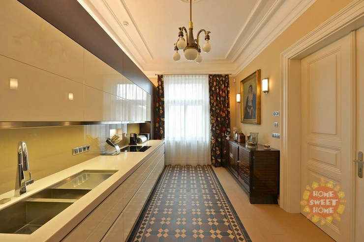Unique elements of Art Nouveau in a apartment make a pleasant atmosphere: high ceilings, stucco, solid wood flooring, renovated tiled stoves, designer light. There are security door, washer, dryer, internet, alarm, videophone.