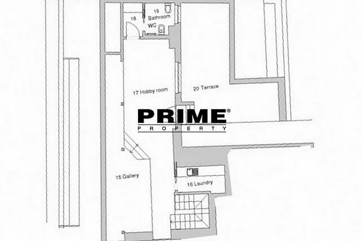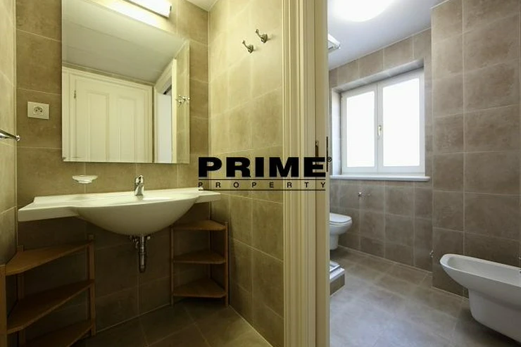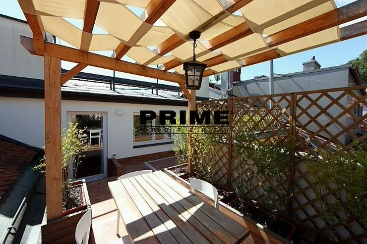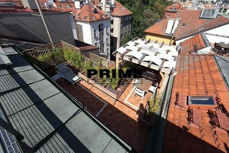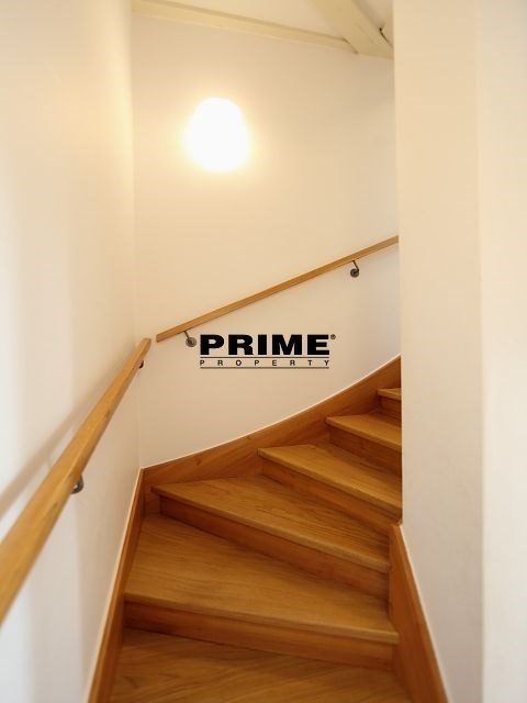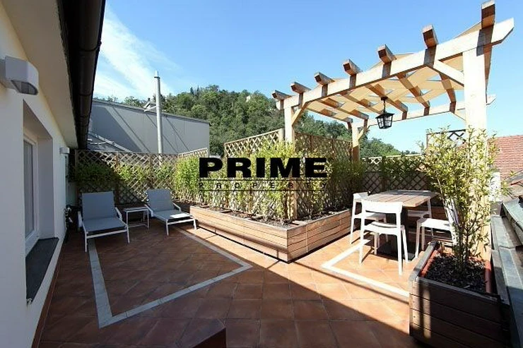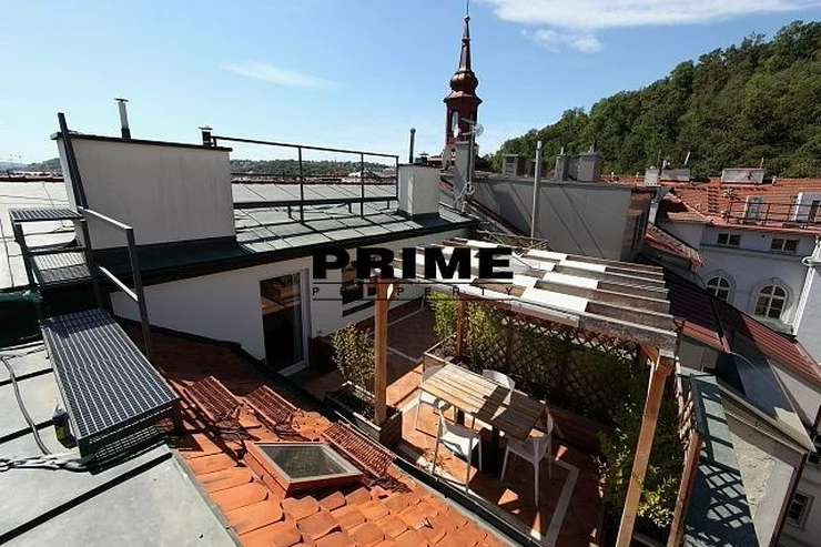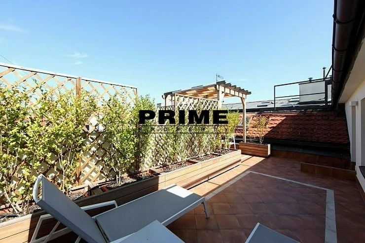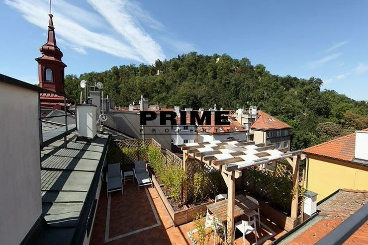 The lower level comprises: a living room with exposed beams, a fully fitted kitchen (with electric cooking hobs, oven, refrigerator and a dishwasher), a master bedroom with a balcony, a walk in closet and a bathroom (bathtub, shower cubicle, 2 sinks, toilet and a bidet), 2 more bedrooms with access to a balcony, a bathroom (bathtub, sink, toilet and a bidet) and 2 small storage rooms. The upper level: a spacious, open plan room with exposed beams (can be used as a guest bedroom, family room or as a playroom for children), a bathroom (shower cubicle, toilet, bidet and sink), a laundry room (washing machine and dryer) and a 35m2 terrace with a pergola and terrace furniture and with views of Petřín Hill Park and Prague Castle.