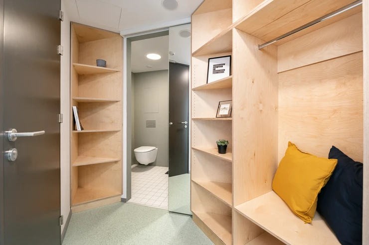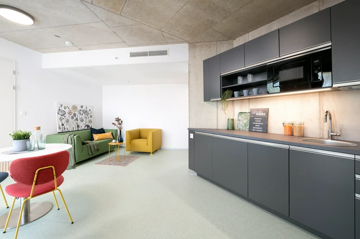 Domeq buildings are designed to offer both privacy and the opportunity to connect with people. Tenants can meet and spend their free time at a supermodern lobby with a pool table, Playstation, TVs, chill zone, study area, two modern community kitchens, coffee & dining area. There are also two terraces in the main building and a bike room free of charge. English-speaking reception at the main building is 24/7 with security guards during the night and weekends.