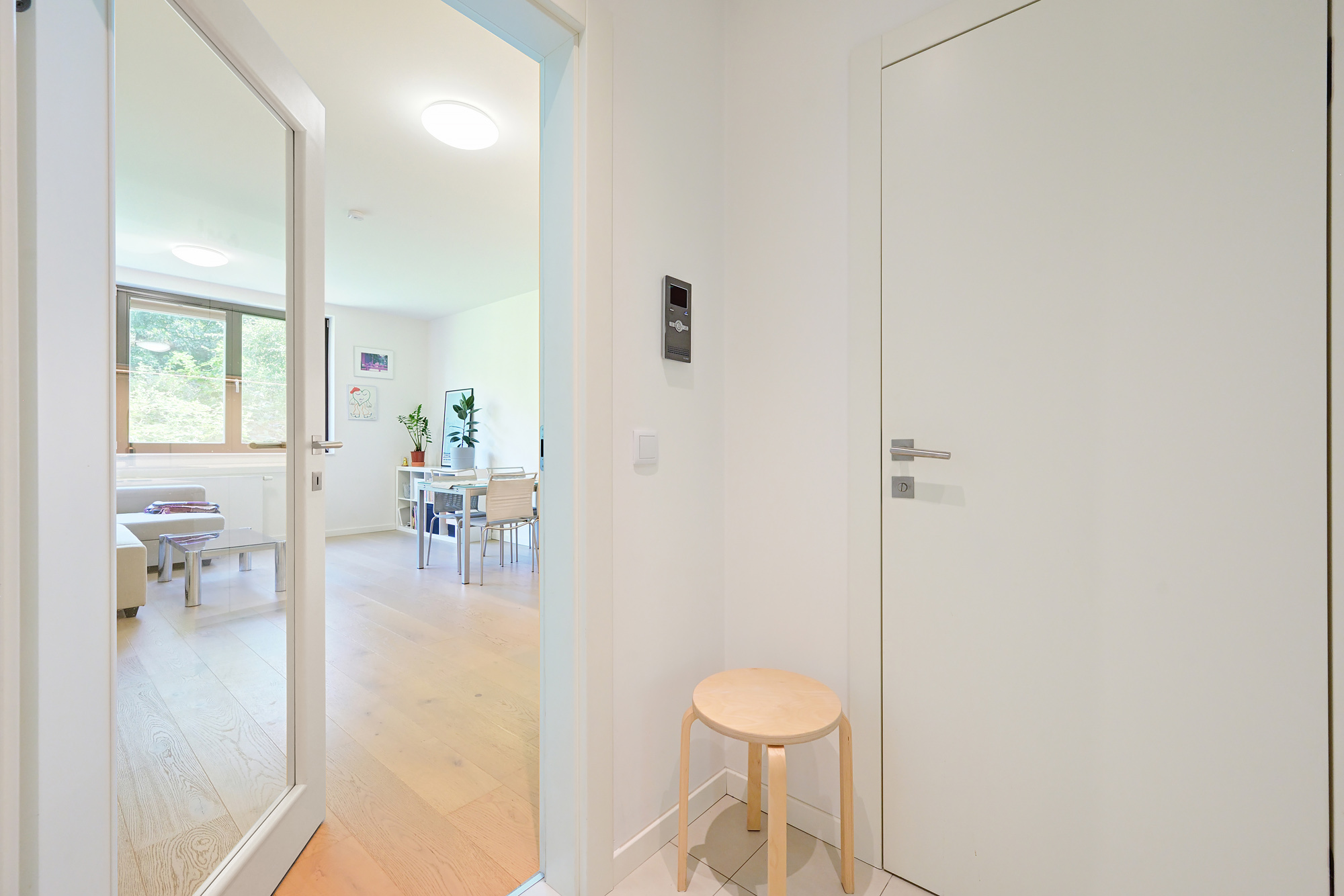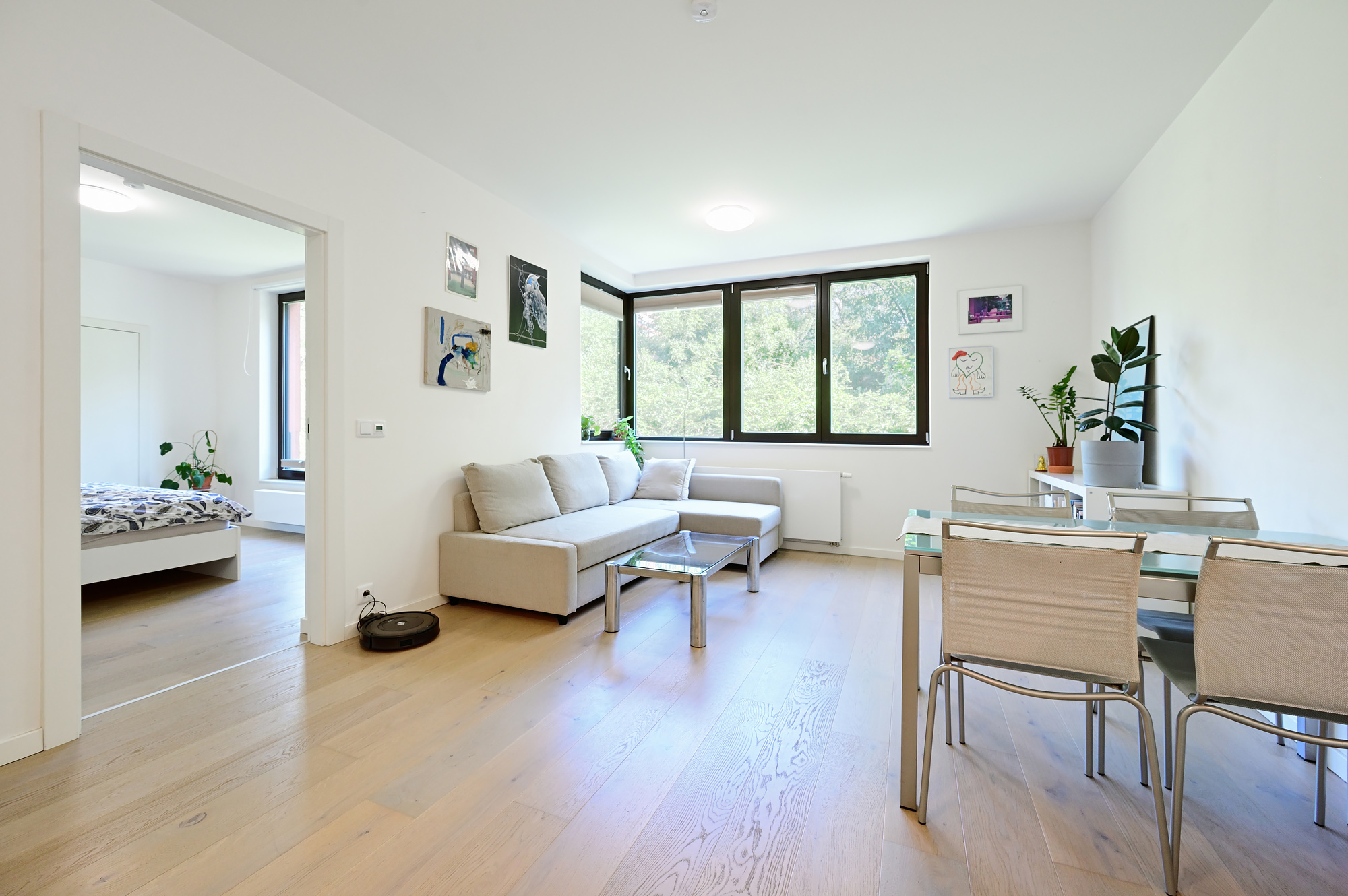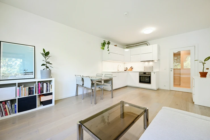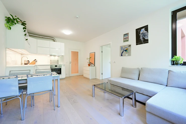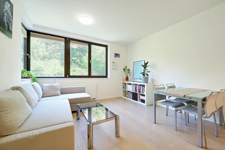 The apartment is situated on the 3rd floor of a residential building on Sinkulova Street, located on the border of Podolí and Nusle. The unit is fully equipped, so you can move in almost immediately. The windows overlook greenery, providing peace and fresh air, even though you’re just a stone’s throw from the city center. The parking space in the stacker system is included in the rental price.