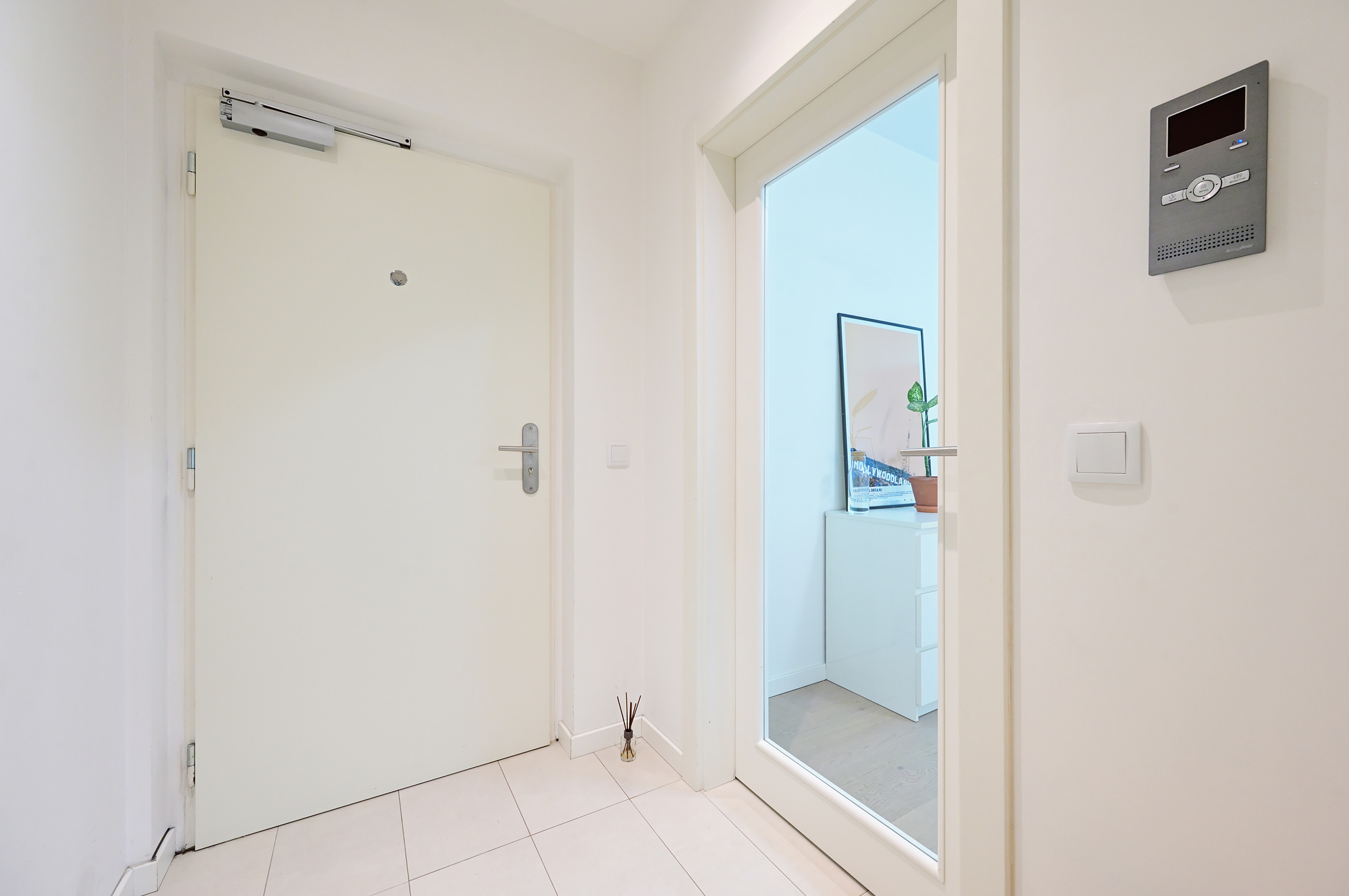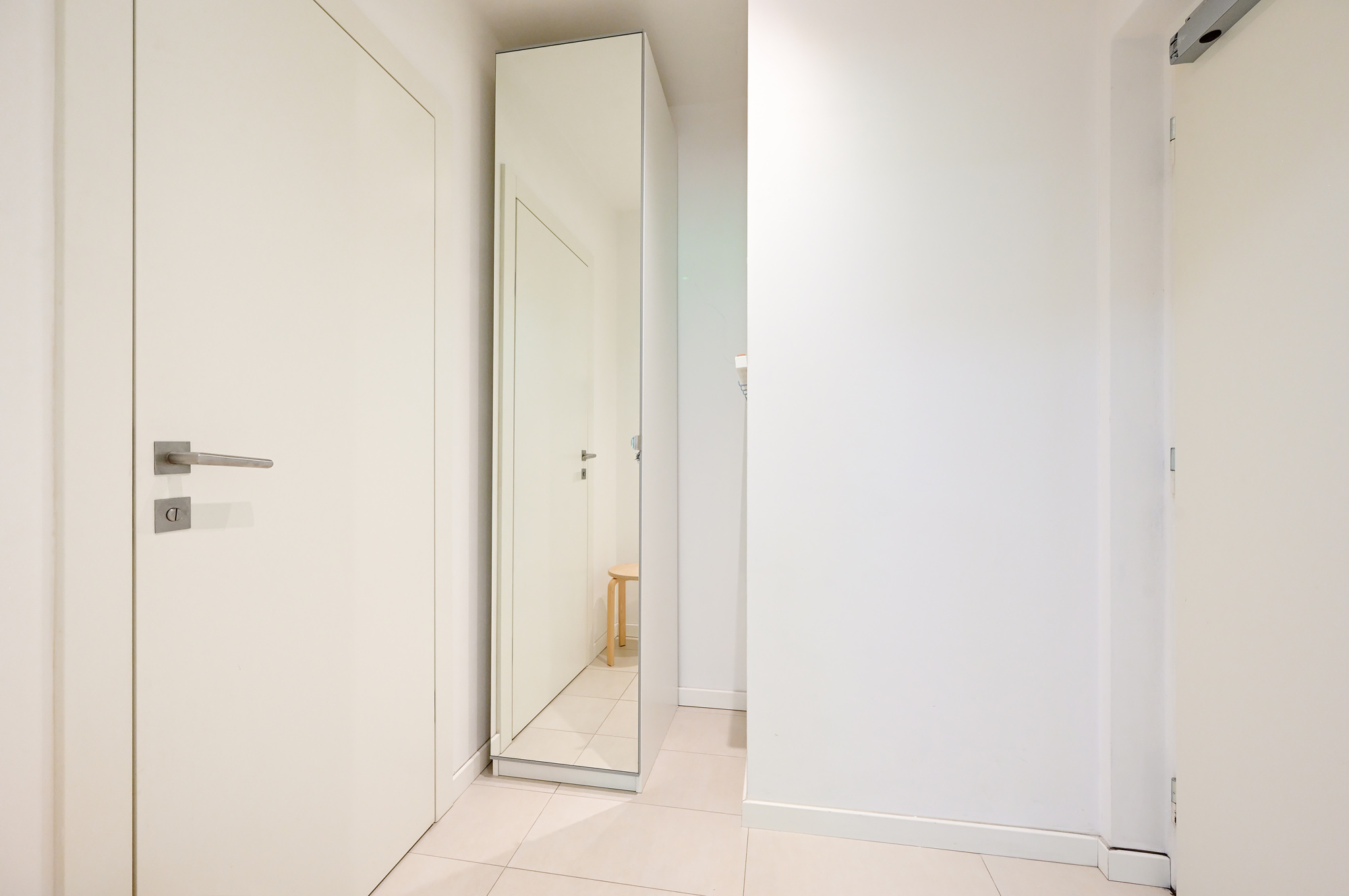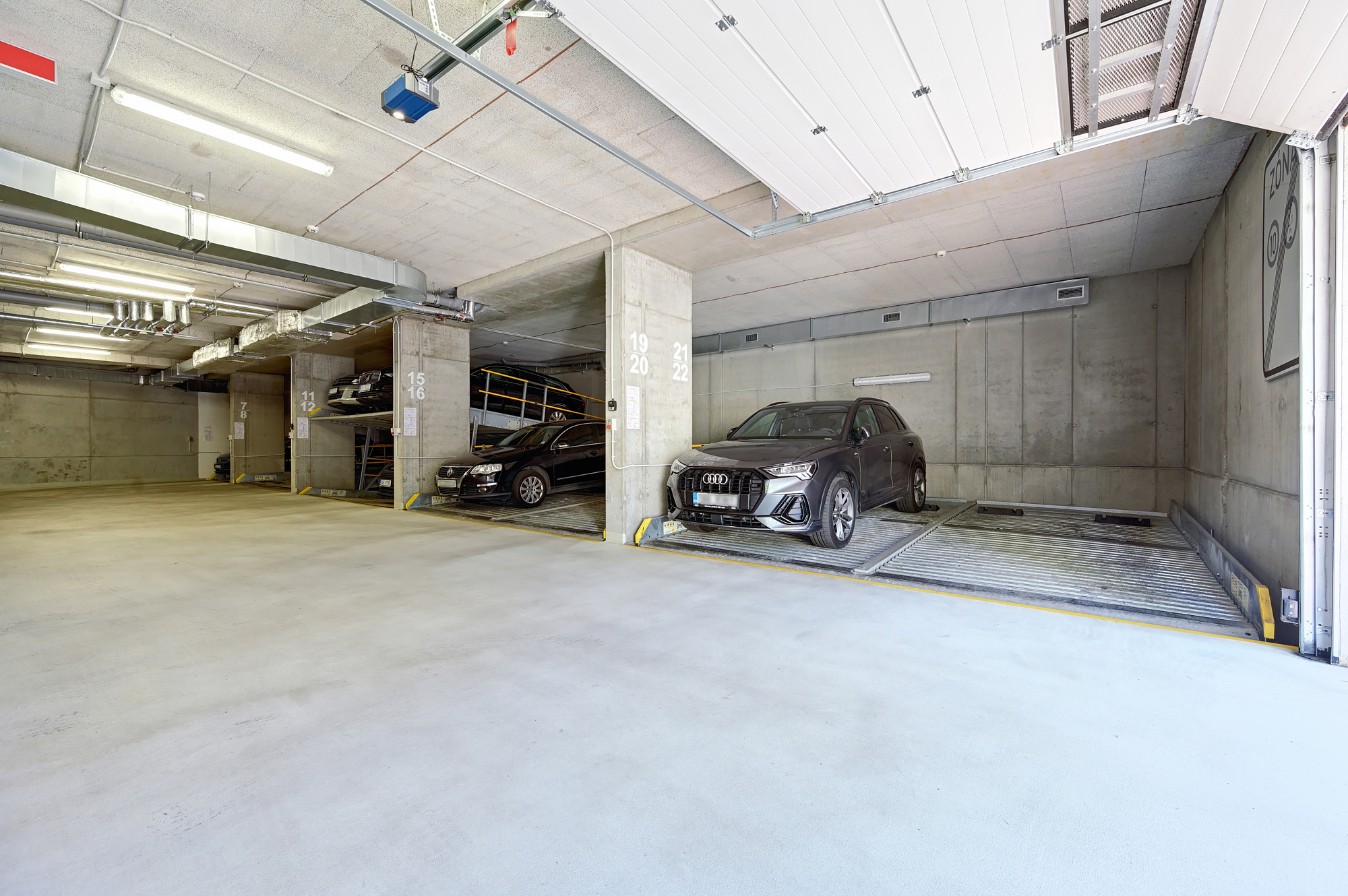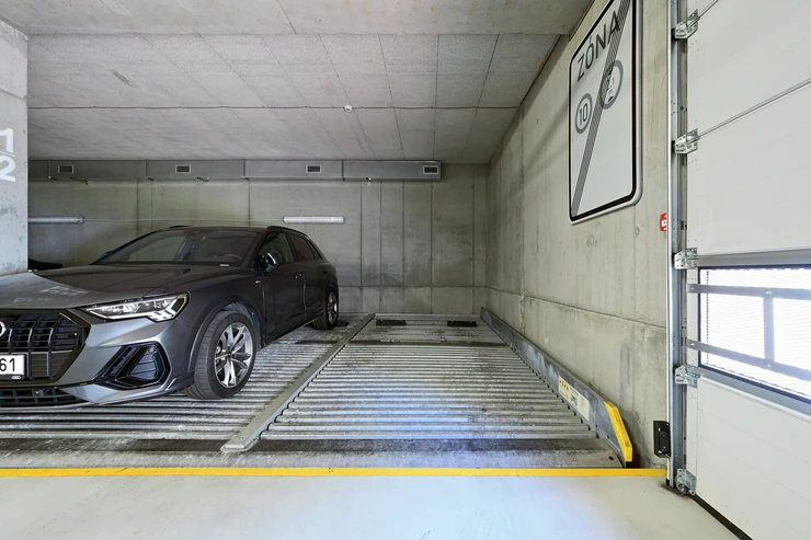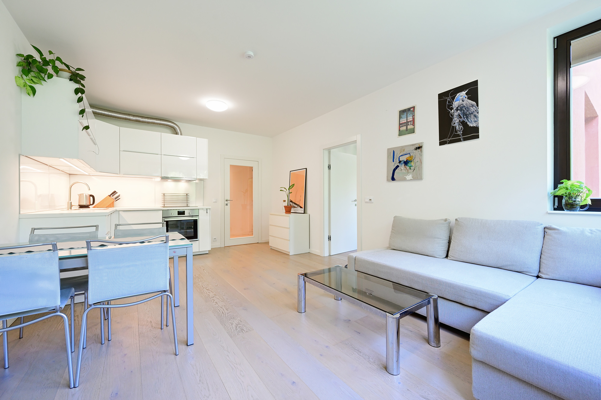 Let me show you a modern, fully furnished 1-bedroom apartment (2+kk) with a total area of 47.1 m², which comes with a parking space in a stacker system located directly in the residential building.