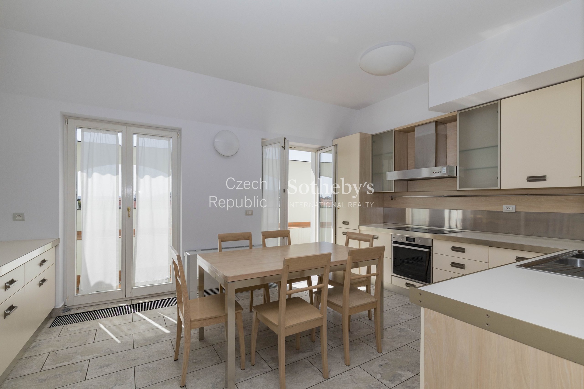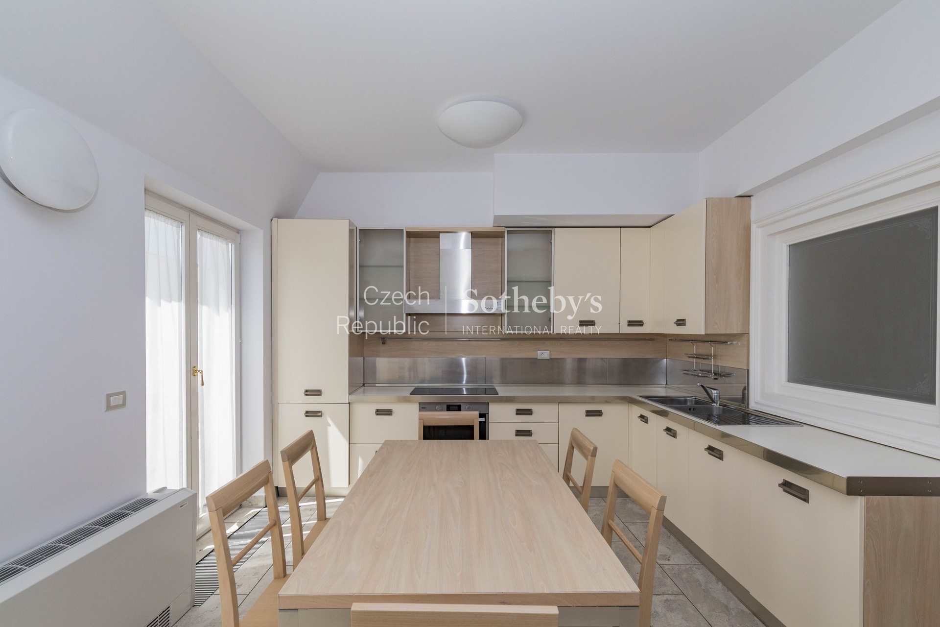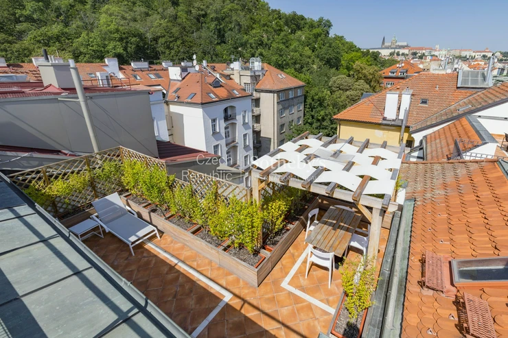 The layout of the apartment is divided into the lower floor, where there is a bright living room, a fully equipped kitchen with a dining room and premium appliances, a master bedroom with access to the terrace, a master dressing room and a bathroom with a bathtub and two more bedrooms with access to the terrace, a second bathroom and a second dressing room. On the upper floor of the apartment we will find a spacious room with high ceilings and exposed beams, a bathroom with a shower, a laundry room and a 35 m² terrace with a view of Petřín Hill and Prague Castle.
