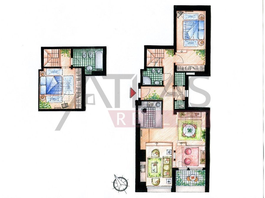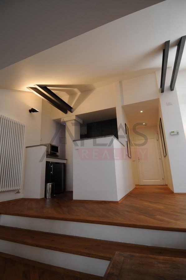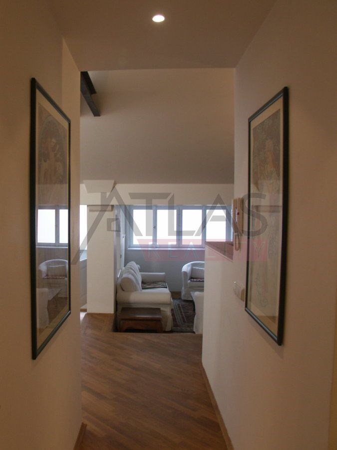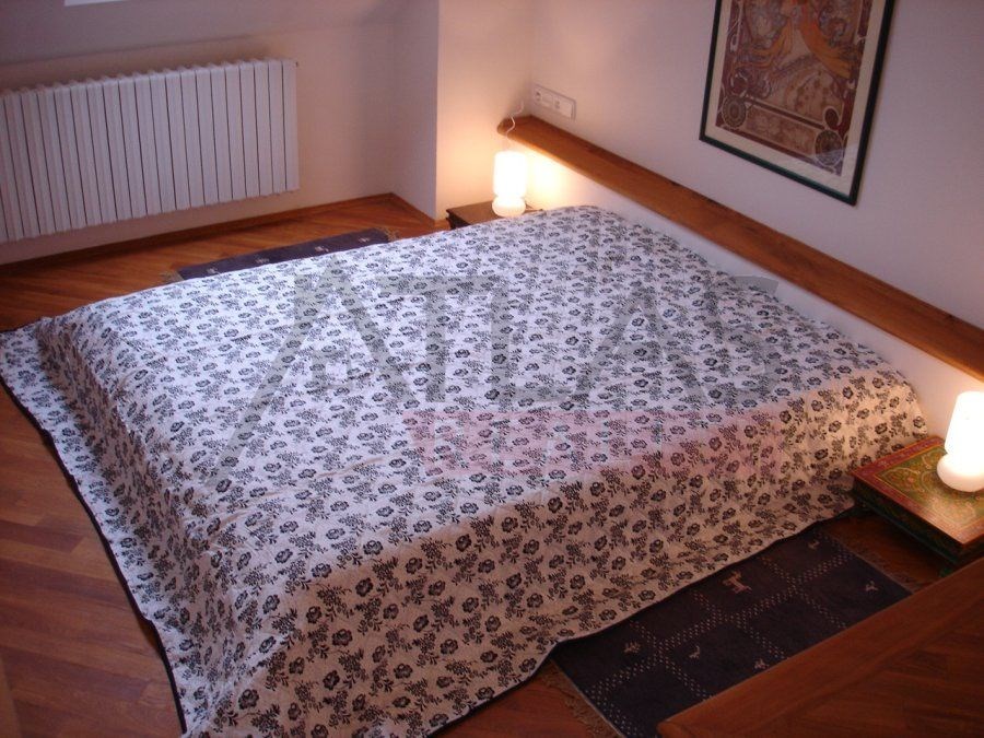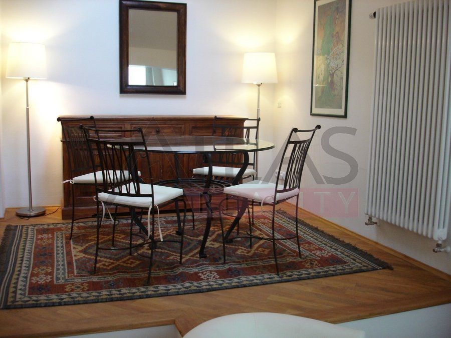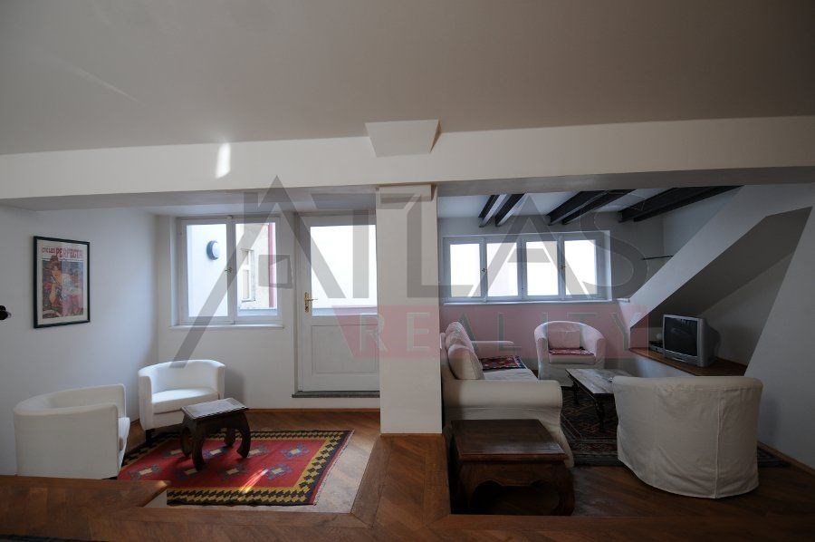 For rent, a two-story attic apartment on the 5th and 6th floors, 96 m2, featuring a magical view of Prague's rooftops and a small balcony with ivy near the living room, original open kitchen facing the living room; impressive fixtures in a luxurious style, oriental carpets (dining room and living room, kitchen, 2 bedrooms, 2 bathrooms, 2 storage rooms). Fully furnished apartment suitable for 4 adults.