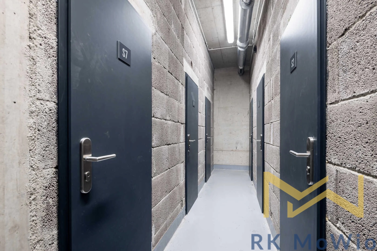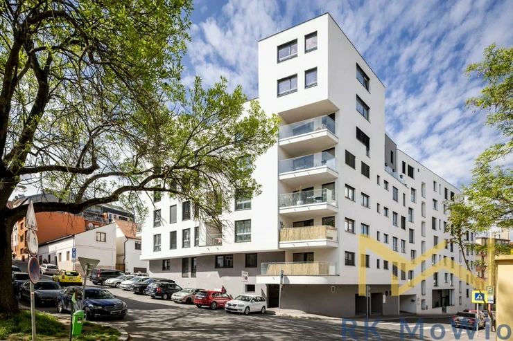 The floor plan of the apartment includes an entrance hall, a living room with a kitchenette, which has access to the loggia and balcony, a master bedroom with access to the balcony and a walk-in closet, two additional bedrooms, 1 bathroom, and a separate toilet. Apartment amenities: kitchen (including refrigerator with freezer, ceramic hob, extractor hood, dishwasher, and electric oven), built-in wardrobes, preparation for washing machine/dryer and high-speed internet, wooden floors and tiles. The rental includes 1 parking space and a cellar. Possibility to rent a second parking space for an extra fee of CZK 3,000/month.