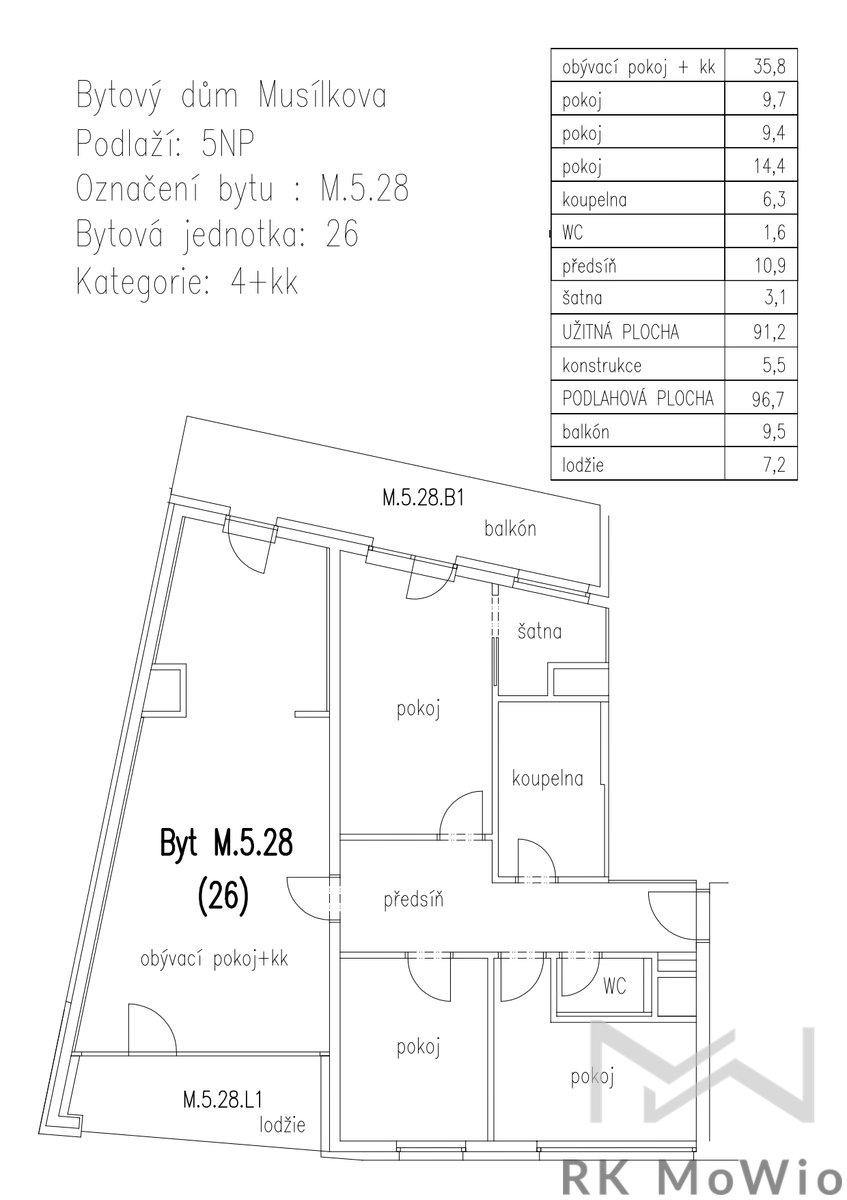 We offer for rent a partially furnished 3 bedrooms apartment with a floor area of 91,2 sqm. with a balcony and loggia and two parking spaces, located on the 4th floor (5 above-ground floors) on Tůmova Street in Prague 5 - Košíře.