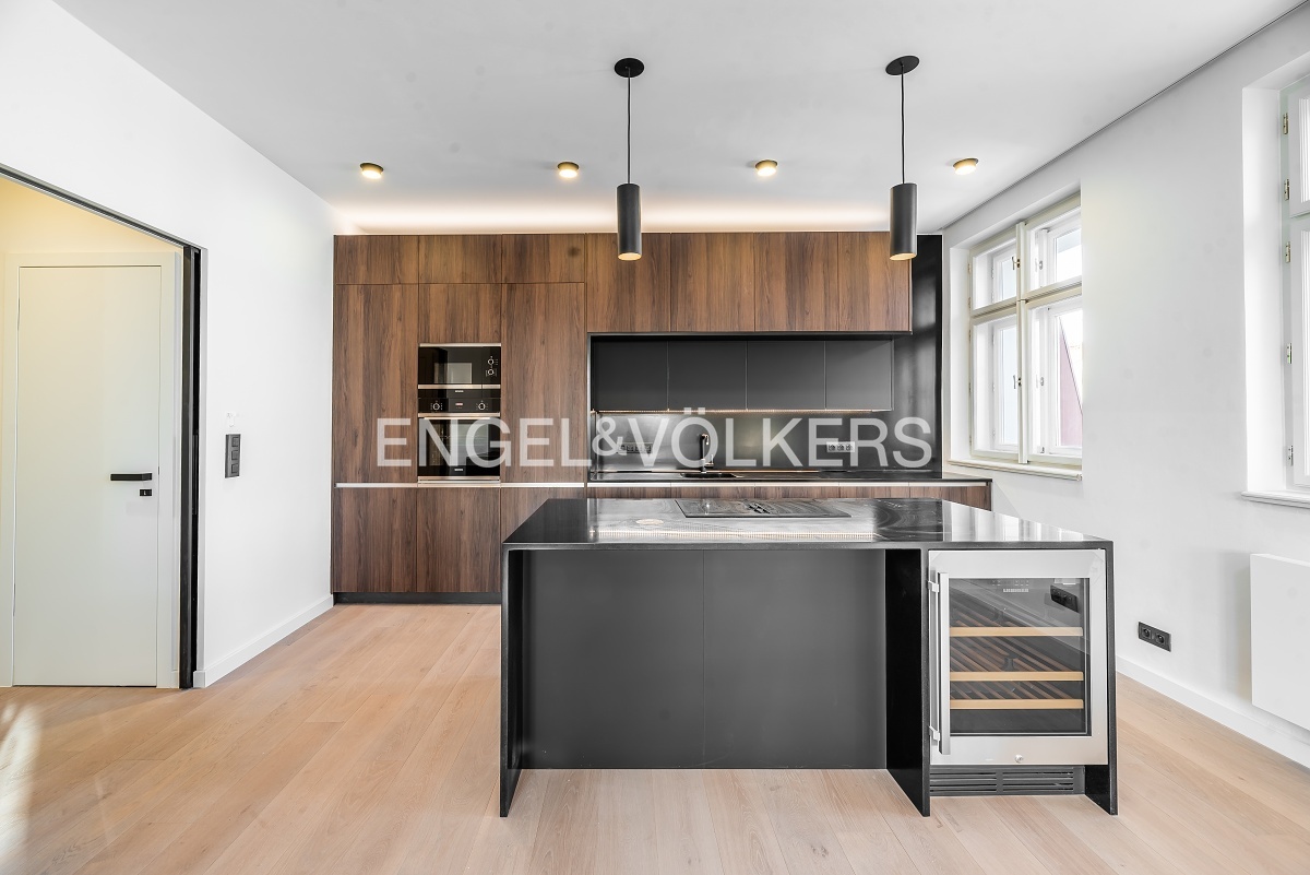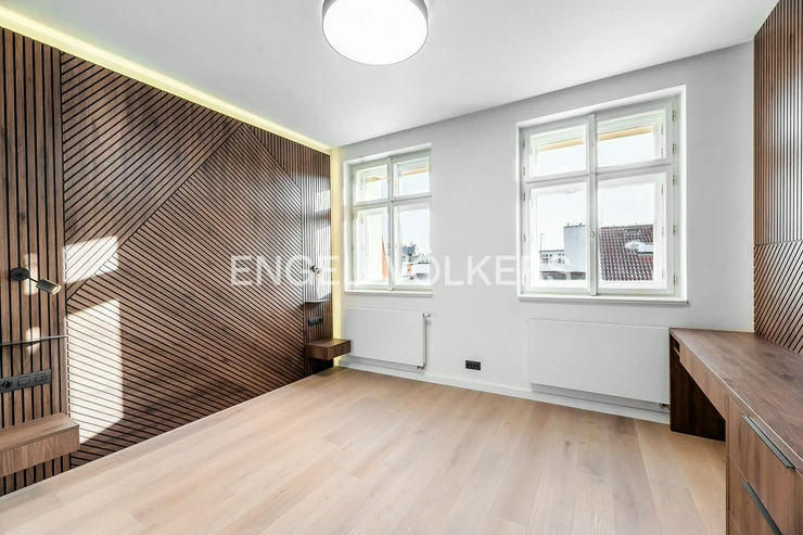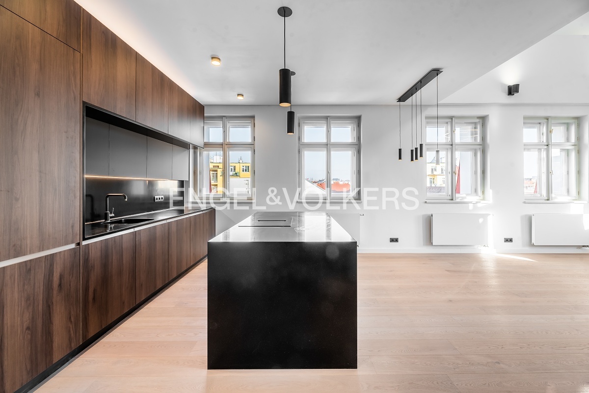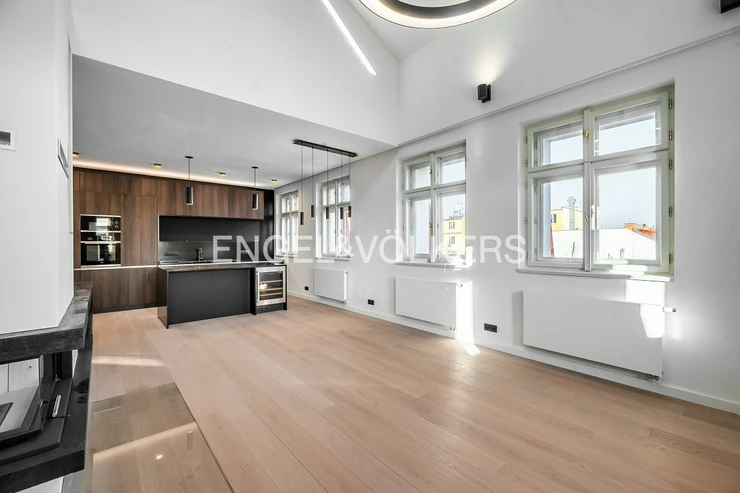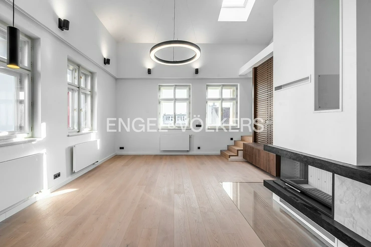 An exclusive air-conditioned duplex apartment 4+kt with terrace, located on the last 4th - 5th floor of a completely renovated building with elevator near Petřín and OC Smíchov shopping center is ready for rent from 15.9.2025.