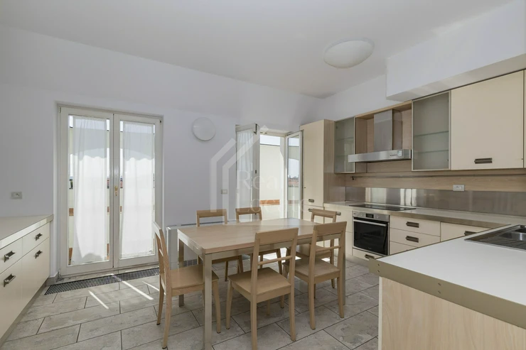 On the lower level of the apartment there is a spacious living room, a fully equipped kitchen, and three bedrooms, each with access to a small terrace. The master bedroom faces the inner courtyard and features its own walk-in closet and a bathroom with a bathtub, shower, bidet, and toilet. In addition, there is another bathroom with a toilet, bidet, and bathtub, and a separate utility room with a washing machine and dryer.