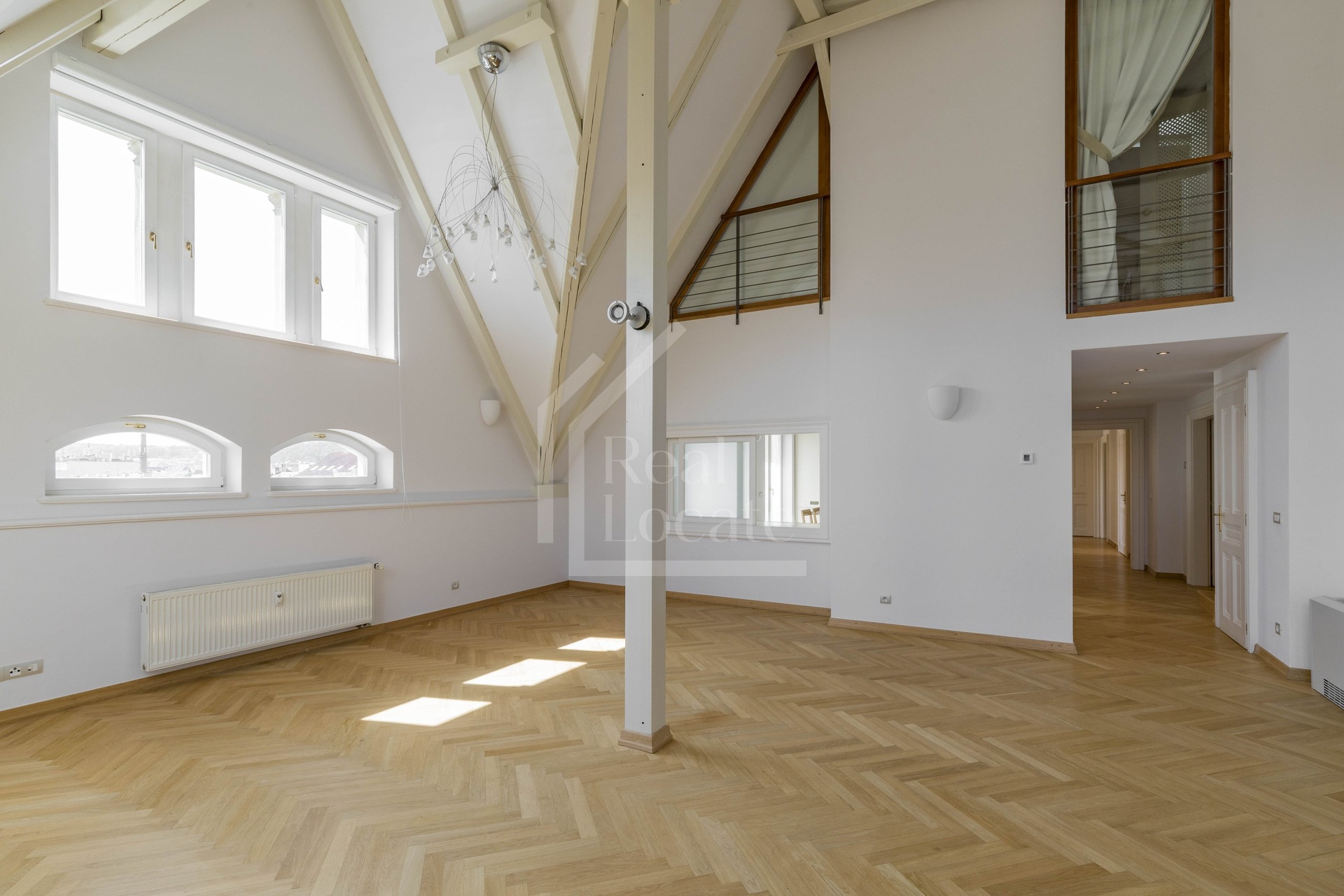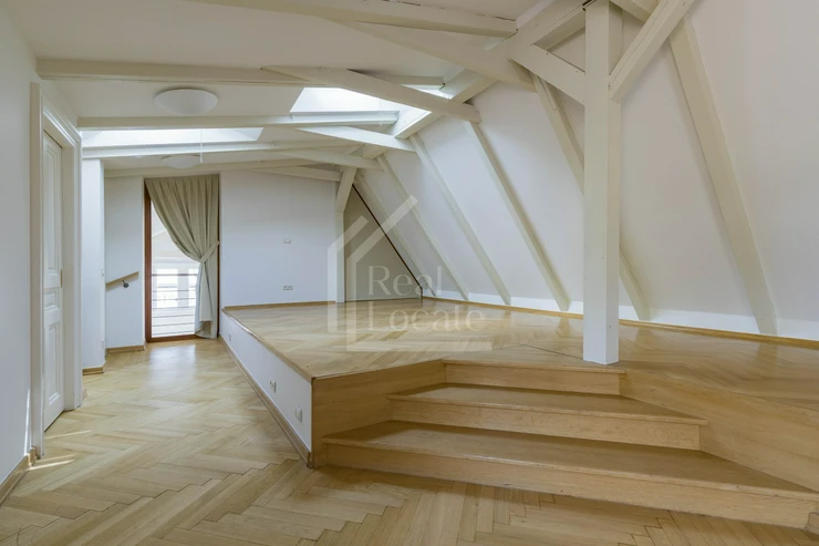 We offer for rent a spacious duplex apartment of 286 m², located in the sought-after and romantic area of Malá Strana. The apartment spans the 5th and 6th floors of a historic 19th-century tenement house that has undergone a complete renovation. This elegant building provides modern comfort with a representative entrance and reception.
