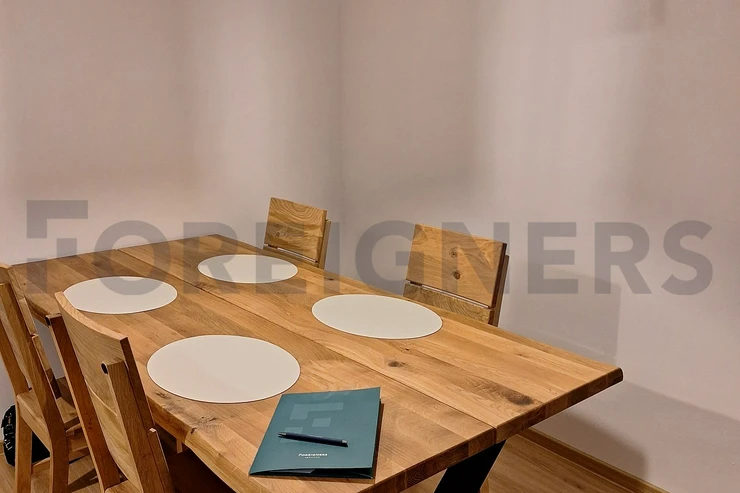 The apartment is rented fully furnished. The kitchen includes a kitchen unit including an induction hob, sink, dishwasher, built-in oven and fridge with freezer. You will also find a beautiful solid dining table with 4 chairs.