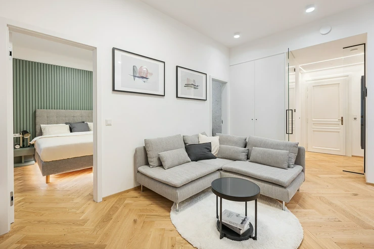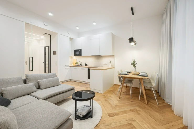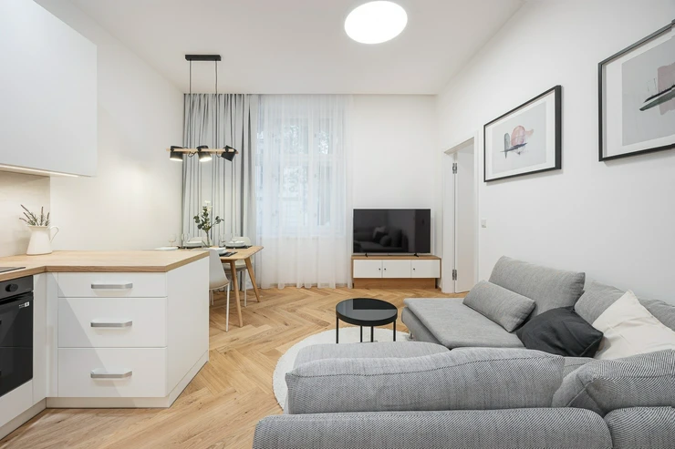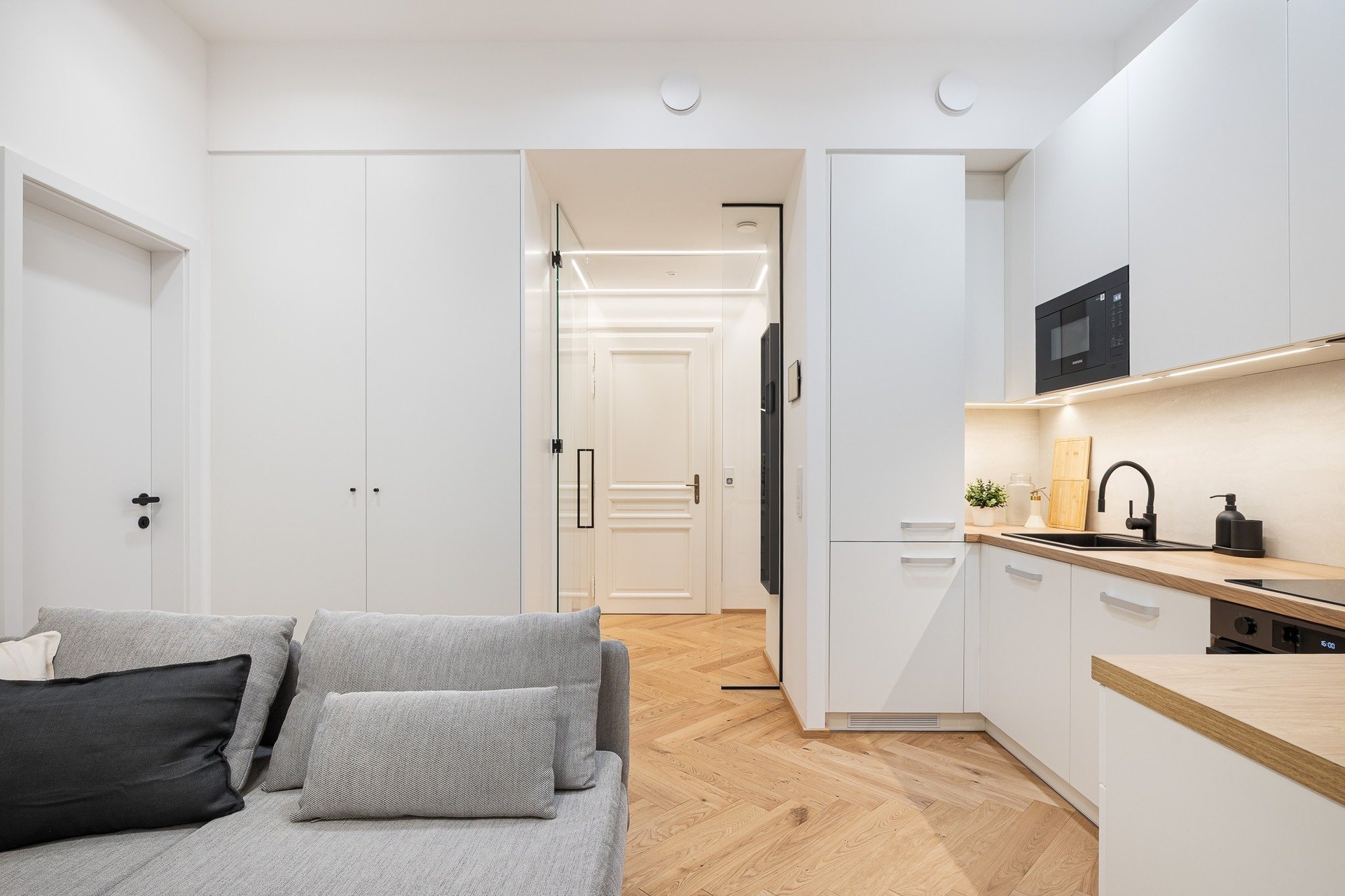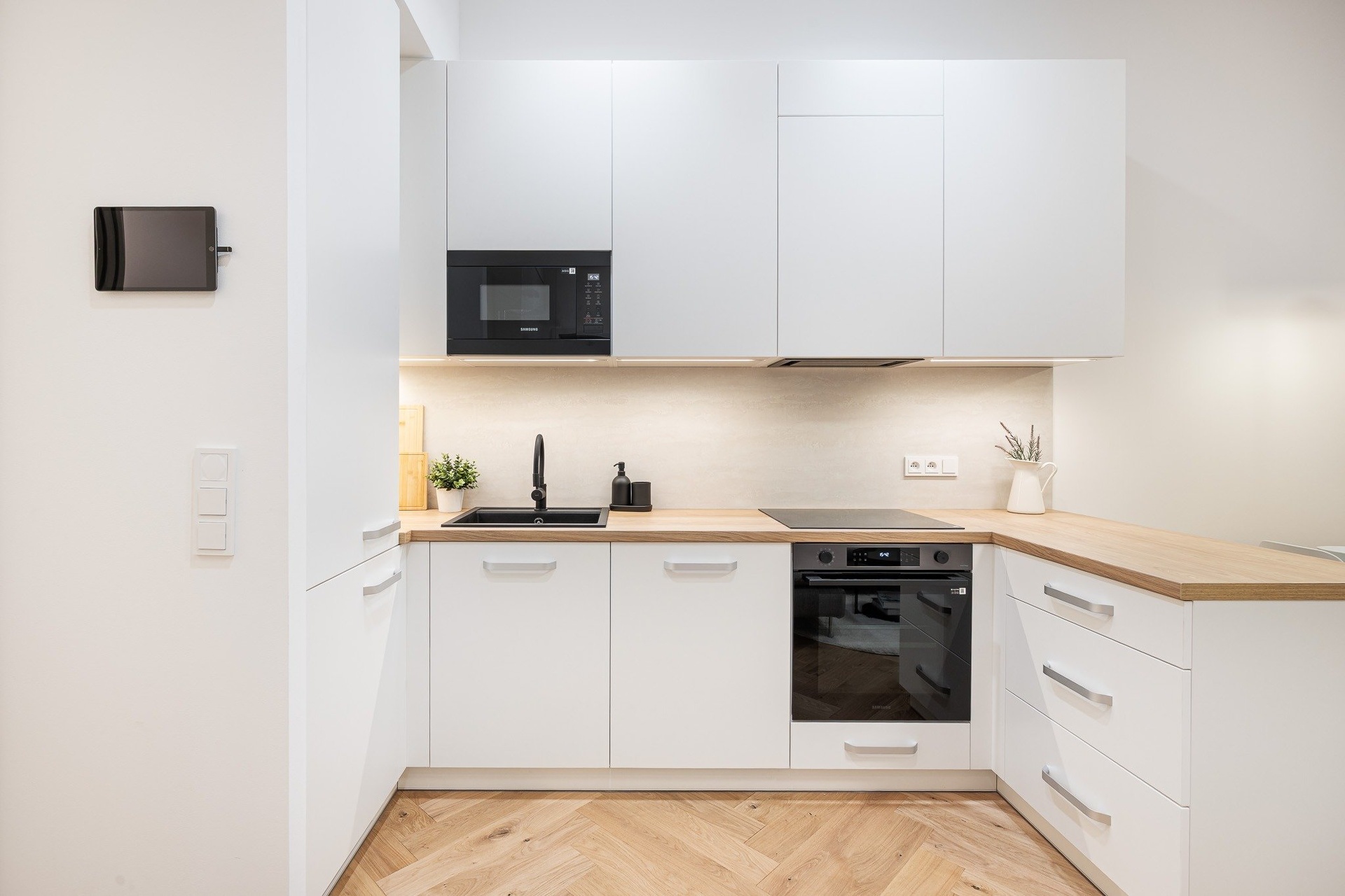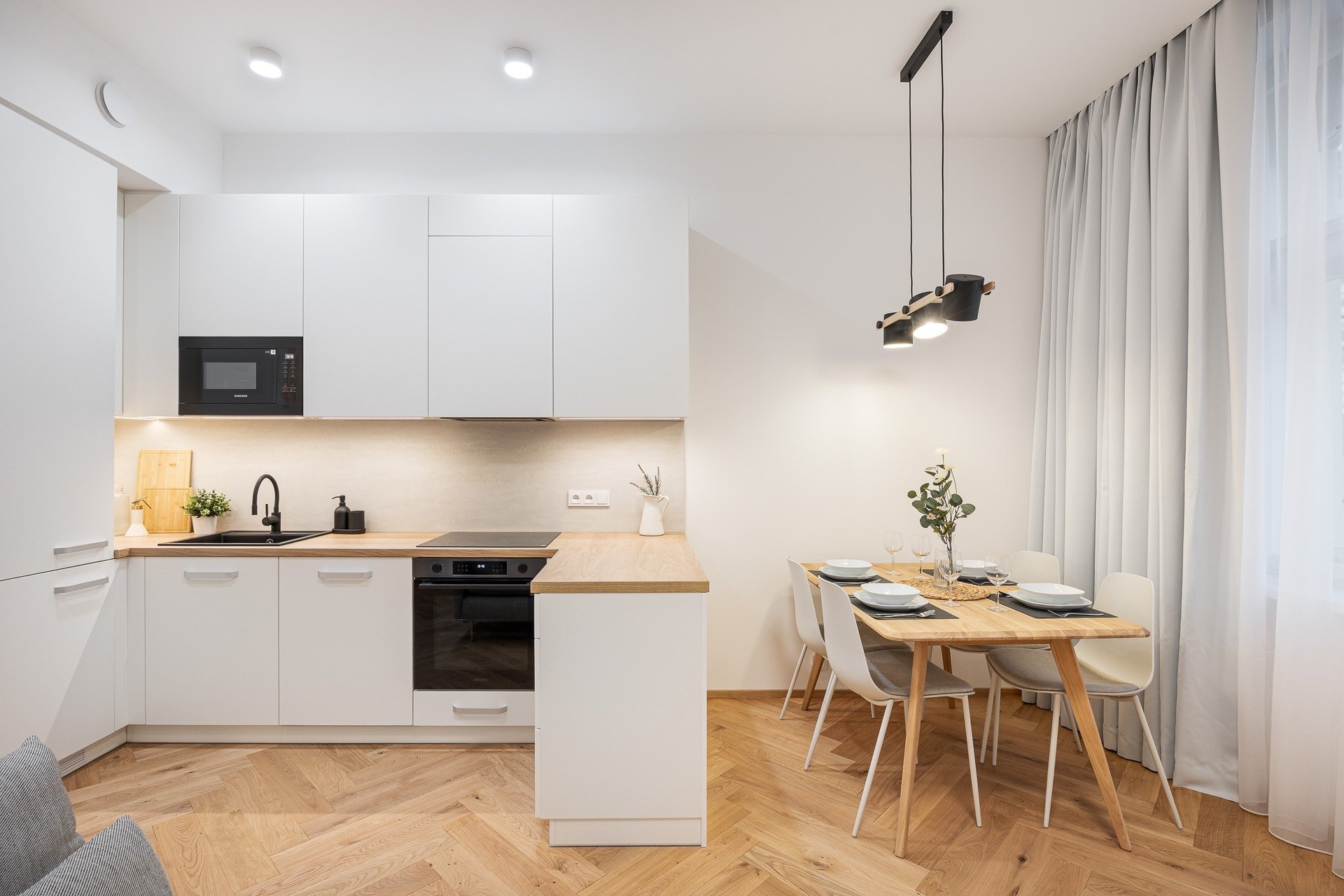 Each apartment includes a high-quality custom kitchen made by Czech craftsmen, stylish furniture, premium appliances, a smart home system, and fast internet.