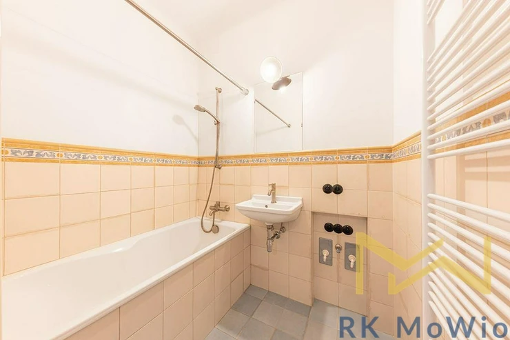 The apartment layout includes an entrance hall, a spacious living room with balcony access, a separate kitchen with a dining area, a main bedroom, a second bedroom, one bathroom (with a bathtub, sink) and a guest toilet. Additional apartment features: kitchen unit with Miele appliances, including a fridge with freezer, induction cooktop, electric oven, dishwasher and extractor hood; the possibility of installing a washing machine and dryer, inlaid parquet floors and period tiles, secure entrance door, unique ceiling rosettes, large windows and double-leaf historic doors with brass fittings. There is an option to rent a secure garage parking space 2 minutes from the building for an extra fee. Photo is illustrative.