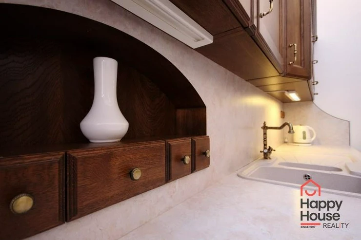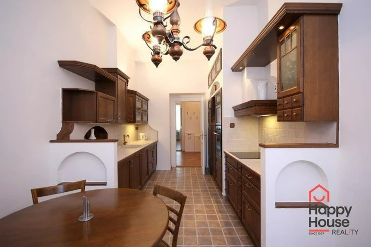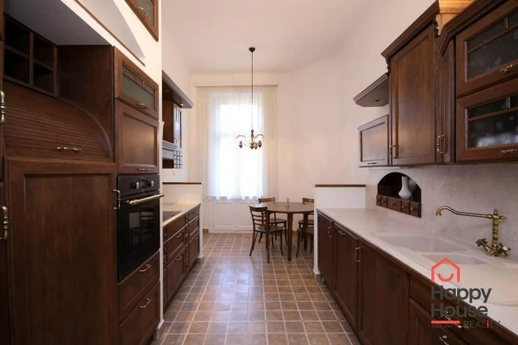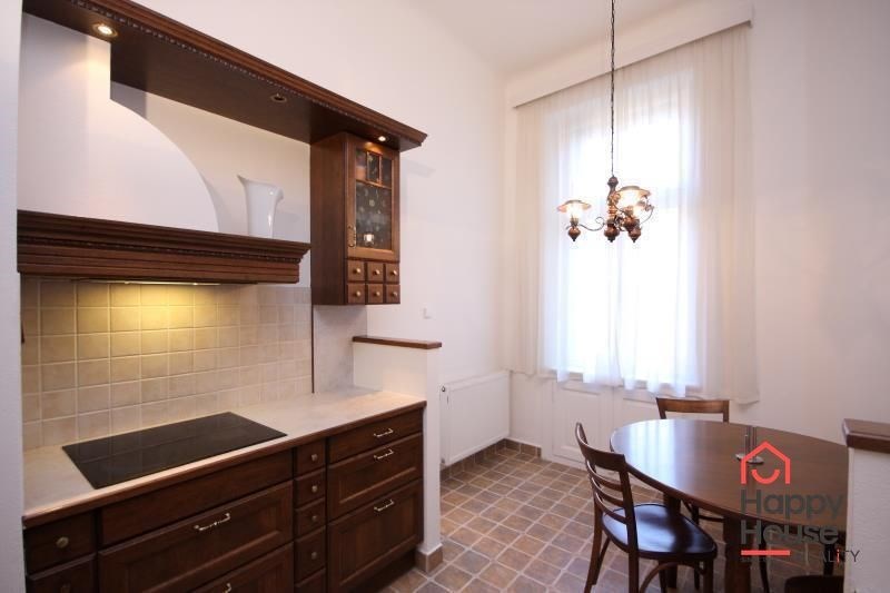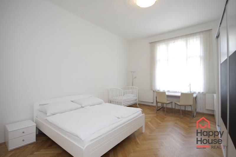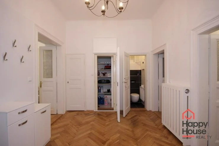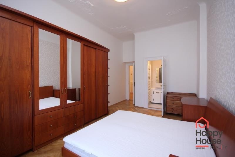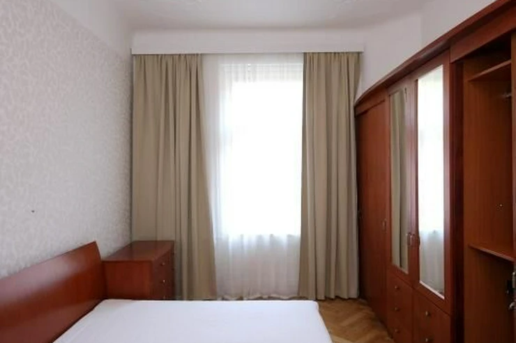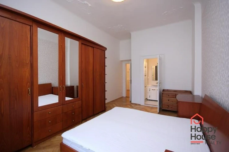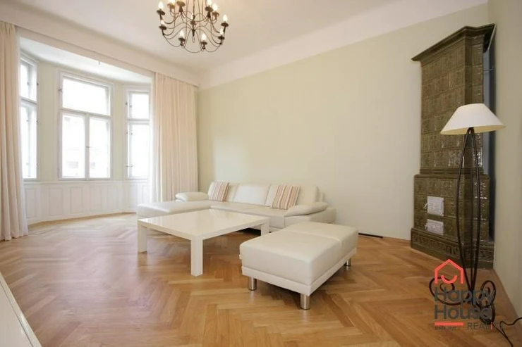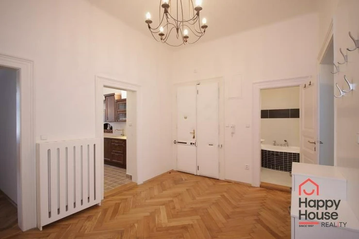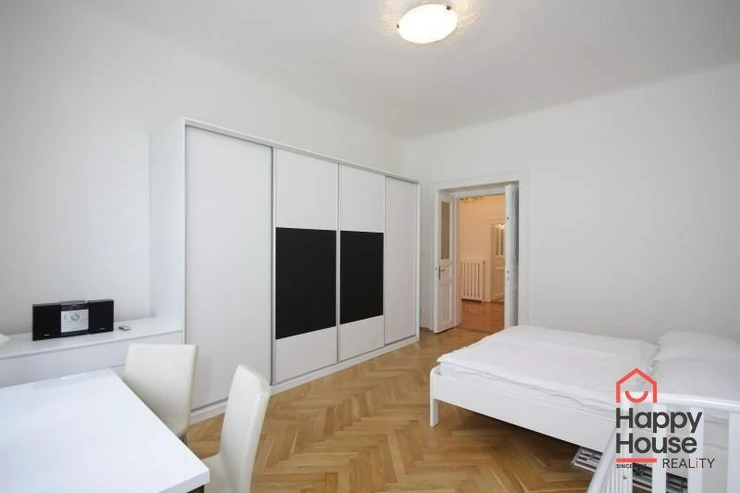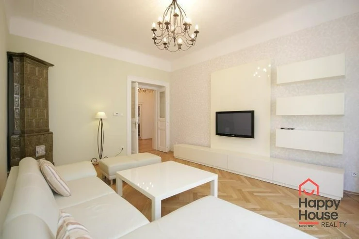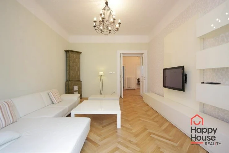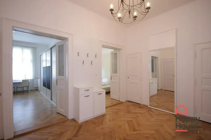 We are offering a bright, fully furnished two-bedroom apartment with a living area of 110 sqm for long-term rent. The apartment is located on the 3rd floor of a brick building with an elevator, near the Vltava River in Prague 1, Nové Město. The windows of the apartment face both the courtyard and the adjacent Vojtěšská Street. The interior of the apartment includes a spacious living room (28sqm), two separate bedrooms accessible from the entrance hall, a separate kitchen, two bathrooms (shower, corner bathtub) and a separate toilet. The living room features tile stove for decorative purposes only. The kitchen is equipped with kitchen units and all necessary appliances – a fridge with freezer, ceramic hob, electric oven, dishwasher, extractor hood, and washing machine. The apartment has ample storage space in the bedrooms, as well as in the wardrobe and utility room. Wooden windows. Parquet and tiled floors. Own gas boiler. Security door. Vodafone internet available in the building. Street parking - zones.