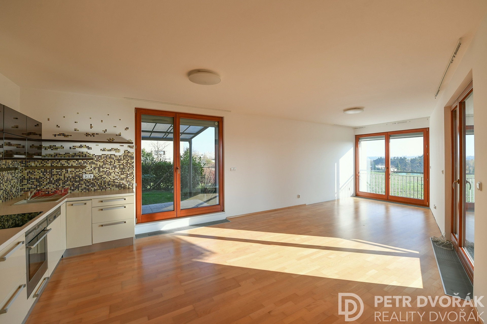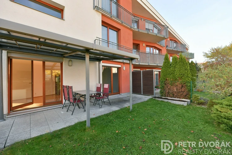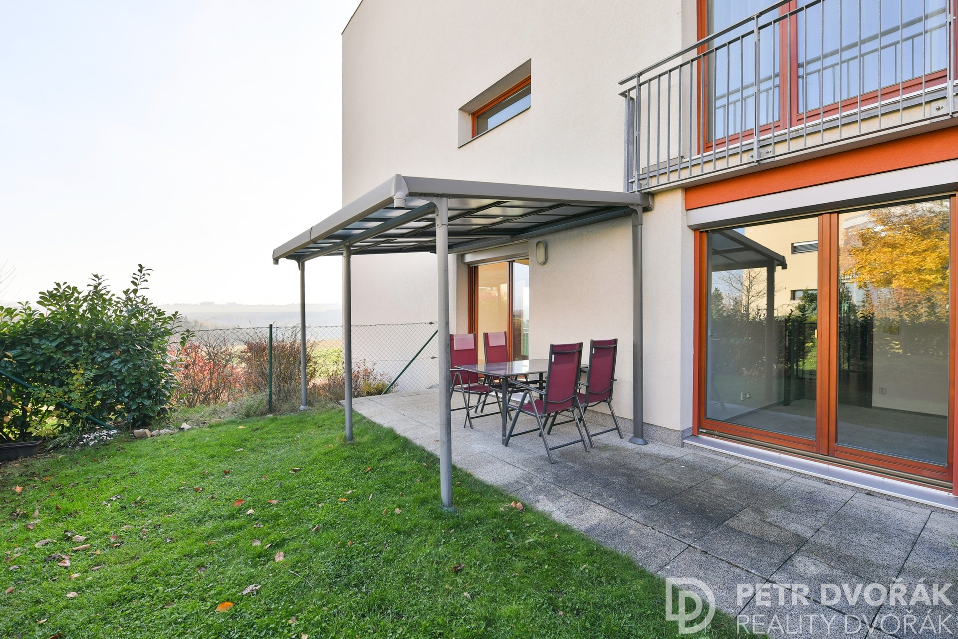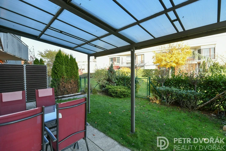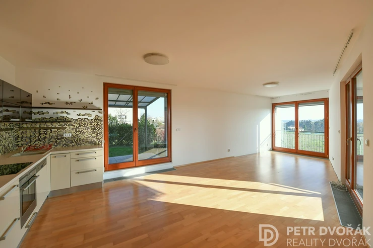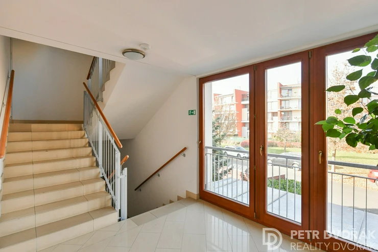 Bright apartment with a balcony, garden terrace, and two garage parking spaces, located on the first floor of a modern residential project on Nad Dalejským údolím Street in a quiet residential area of Prague 5 – Stodůlky.
