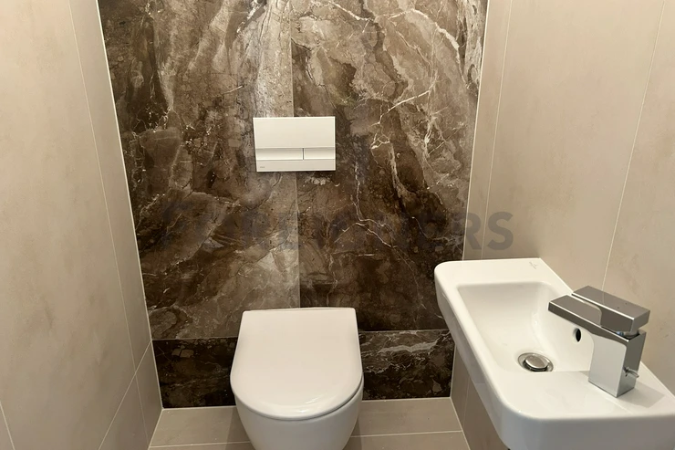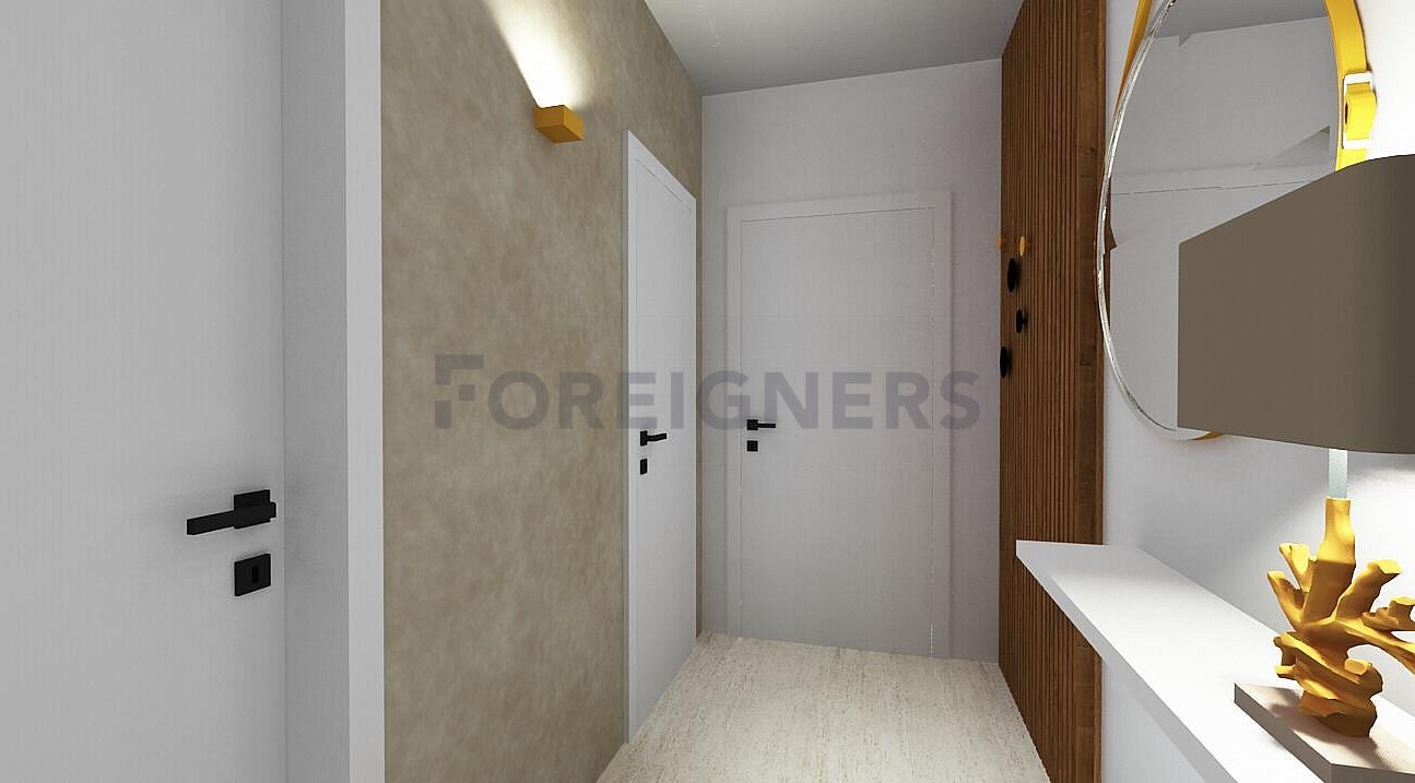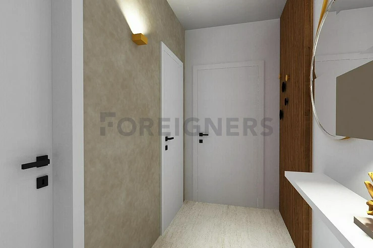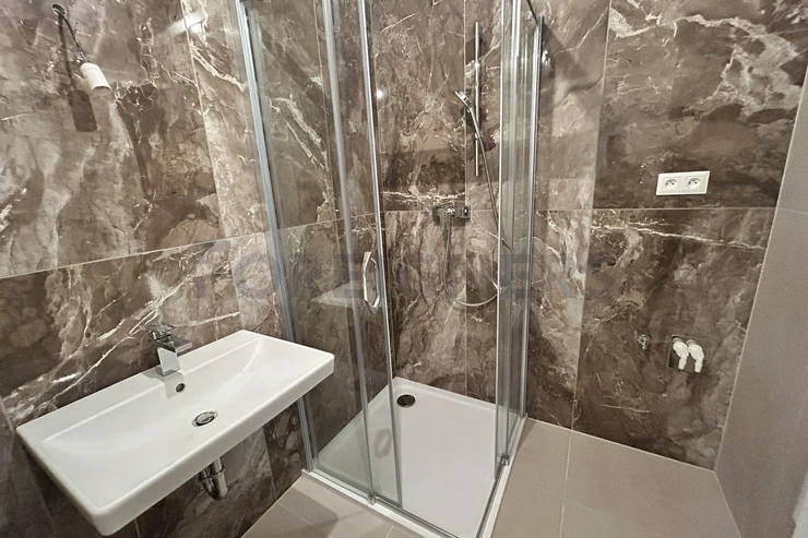 Upon entering the apartment, there is a hallway leading to the bathroom, which is equipped with a shower, washbasin with cabinet, mirror, toilet, and space for a washing machine with dryer.