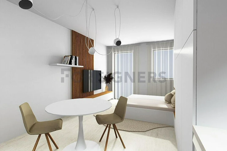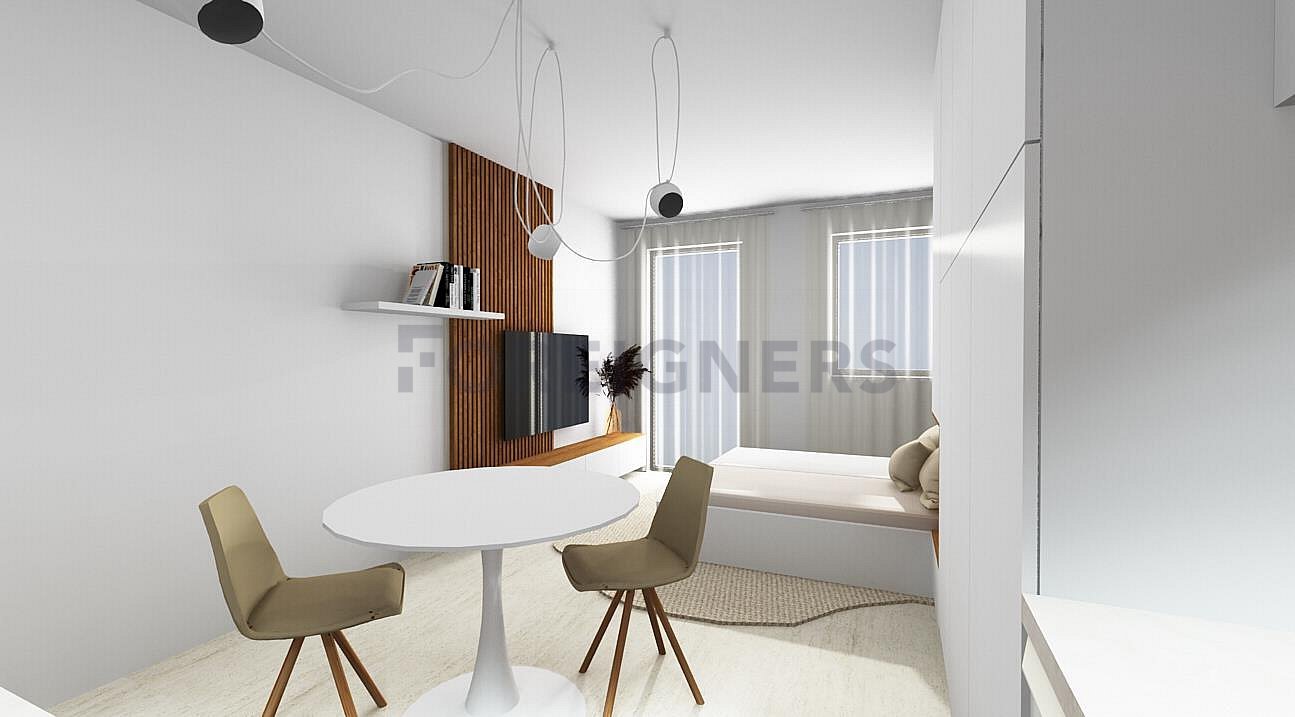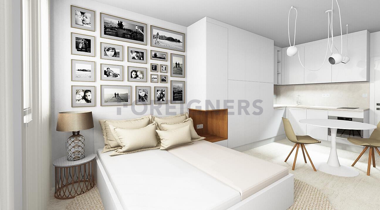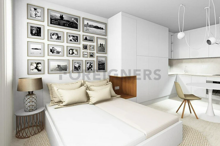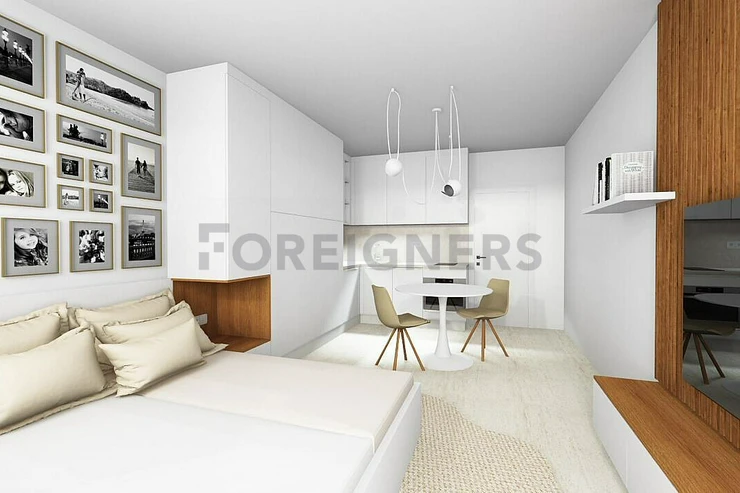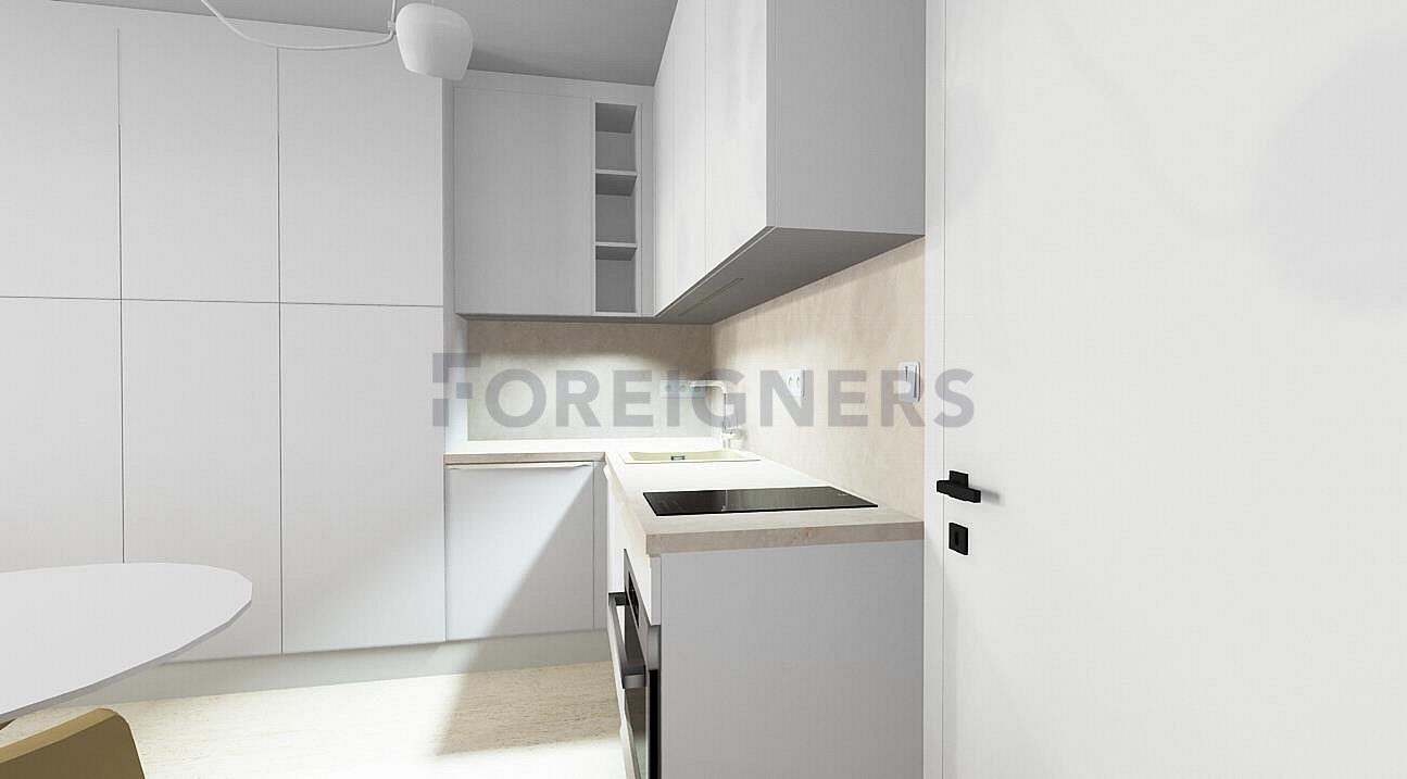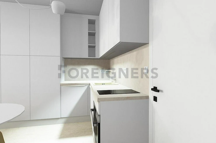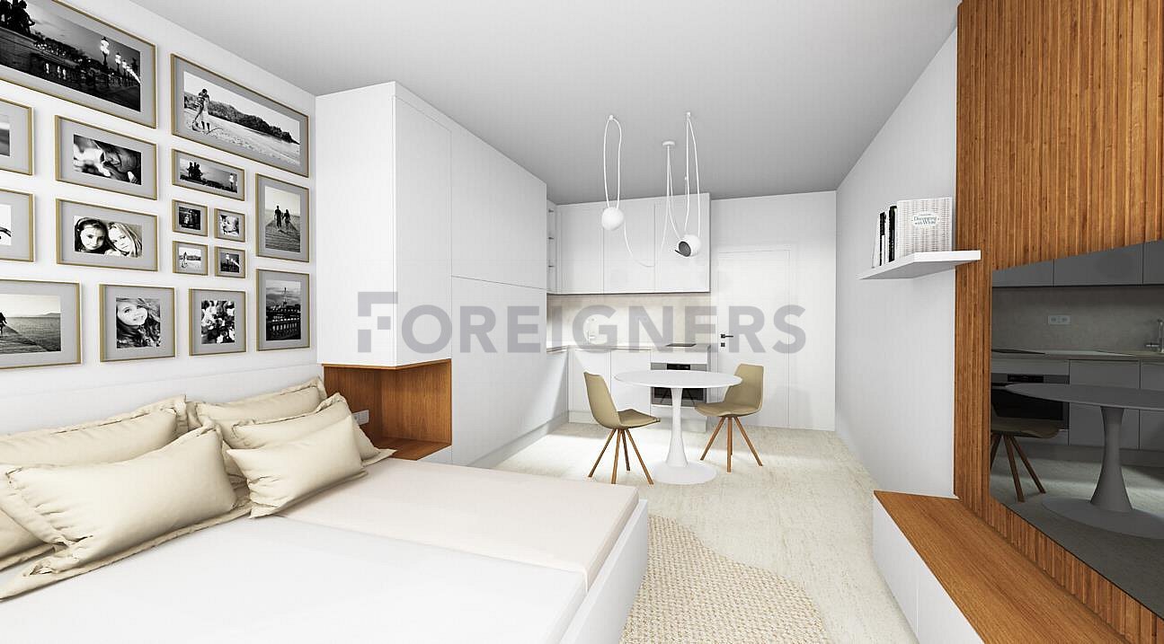 The main part of the apartment consists of a bright living room with a kitchen corner and access to the balcony. The kitchen is fitted with built-in appliances – fridge, dishwasher, induction hob, cooker hood, microwave and sink. The living area offers space for a dining table, chairs, TV cabinet and a bed frame (without mattress), as well as built-in wardrobes and storage.