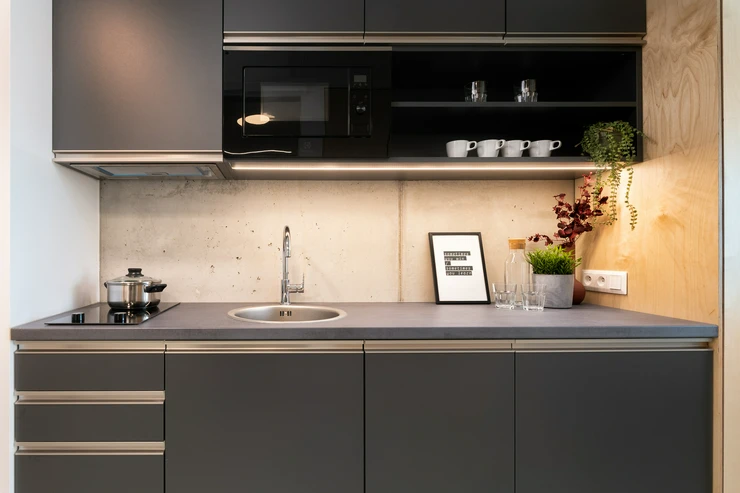 - basic kitchen equipment: electric kettle, dishes, cutlery, pots, pans, glasses, mugs, plates