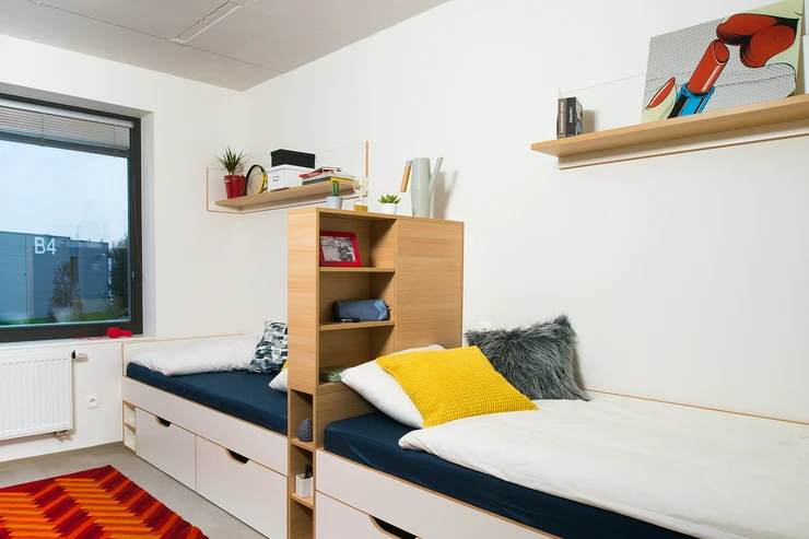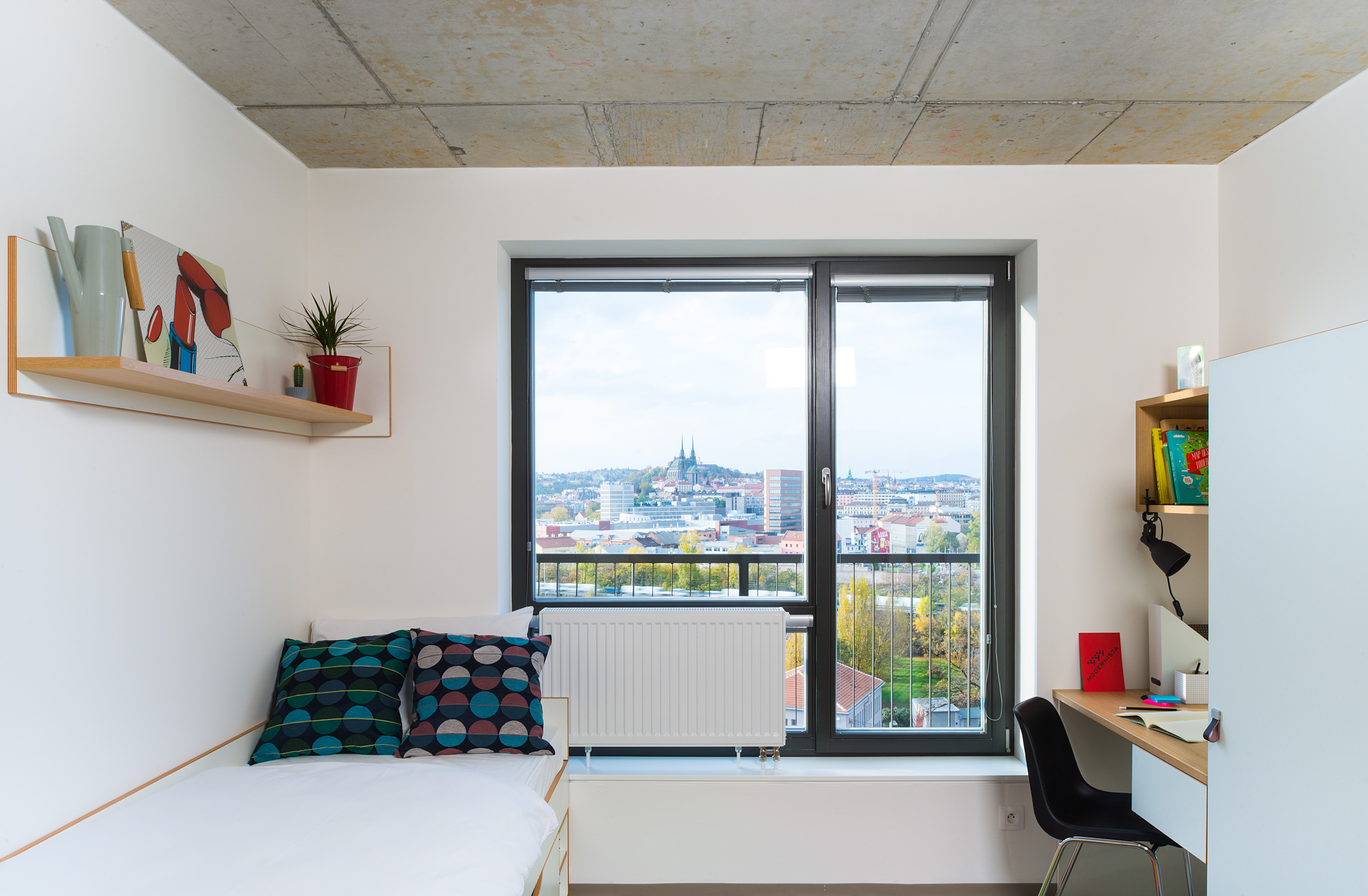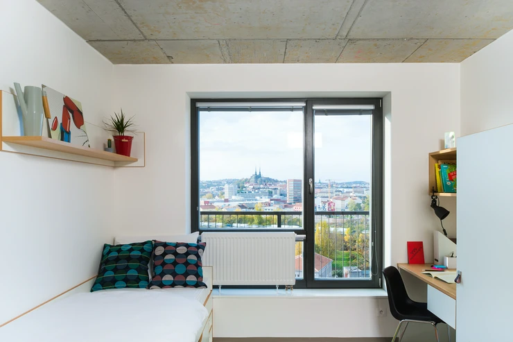 The building also has terraces on the 6th and 13th floors, shared study rooms, and a common lobby (pool table, PlayStation, piano, TV). A gym and parking space are available for an additional fee.