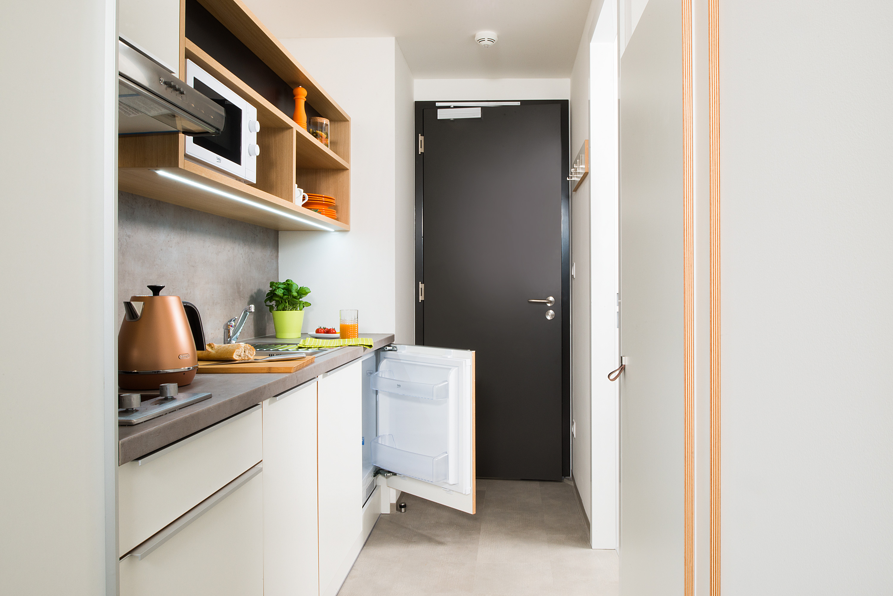 kitchenette incl. small refrigerator, glass-ceramic hob, and microwave
