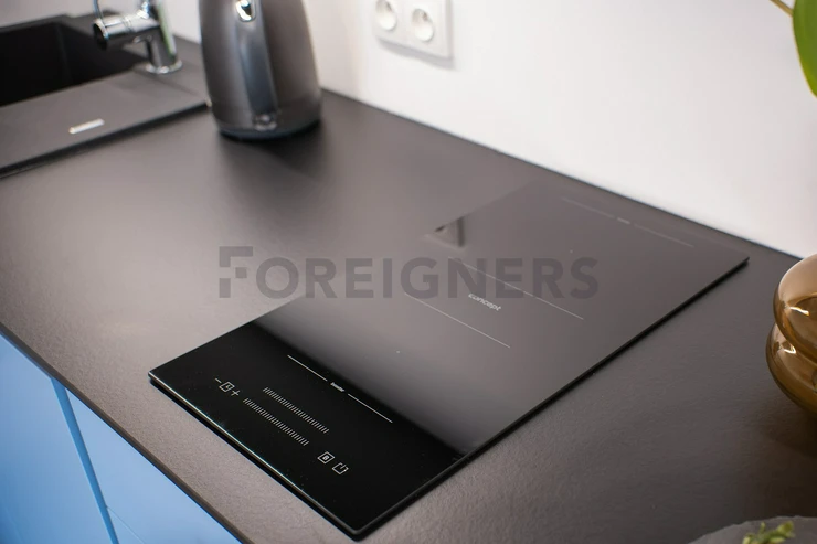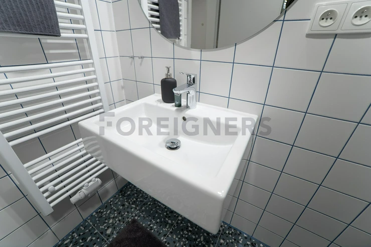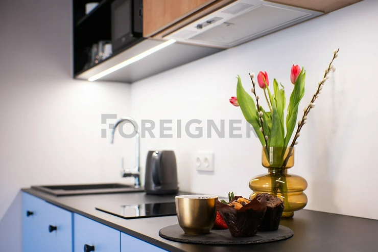 The kitchen with sink is equipped with all necessary appliances and equipment - two-zone induction hob, hood, refrigerator, microwave oven, built-in waste basket.
