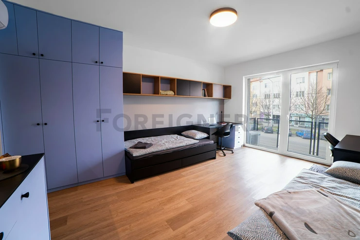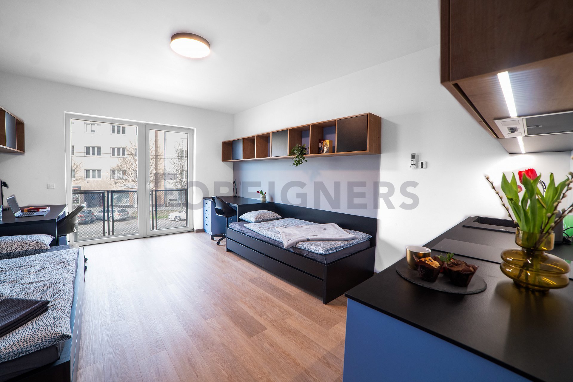The studio also includes 2 work tables with a storage box (table size 150 x 75 cm) + 2 chairs; 2 single beds with storage, 2 bookcases; 4 lamps; magnetic wall; 2 wardrobes.