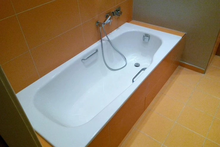 Bathroom with bathtub with space for a washing machine.