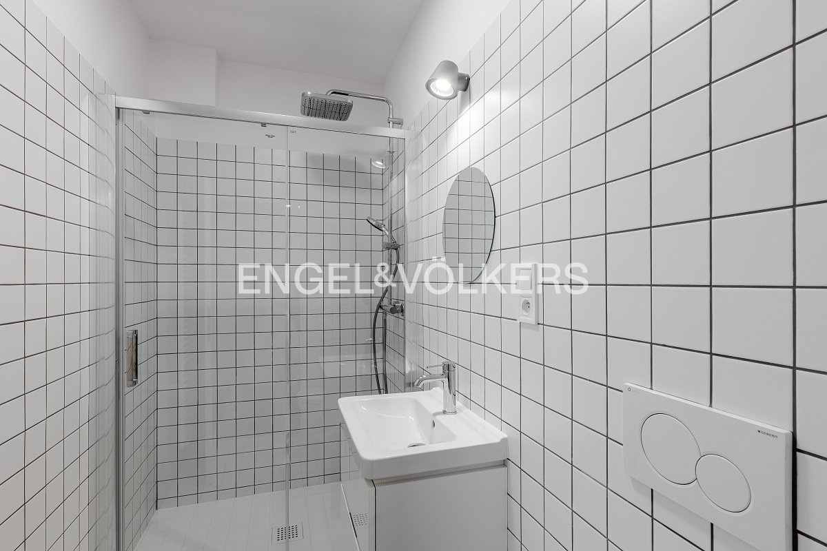 A brand new studio apartment is available for rent from 1. 12. 2025, located on the fifth floor of a newly built extension. The layout of the apartment consists of an entrance hall, bathroom with shower and toilet, and a main living area combining a living room and a fully equipped kitchenette. The main advantages include air recovery, high ceilings, preserved wooden beams, and a spacious terrace.
