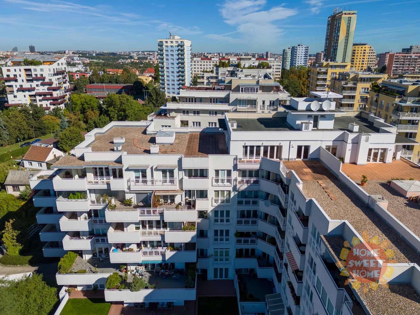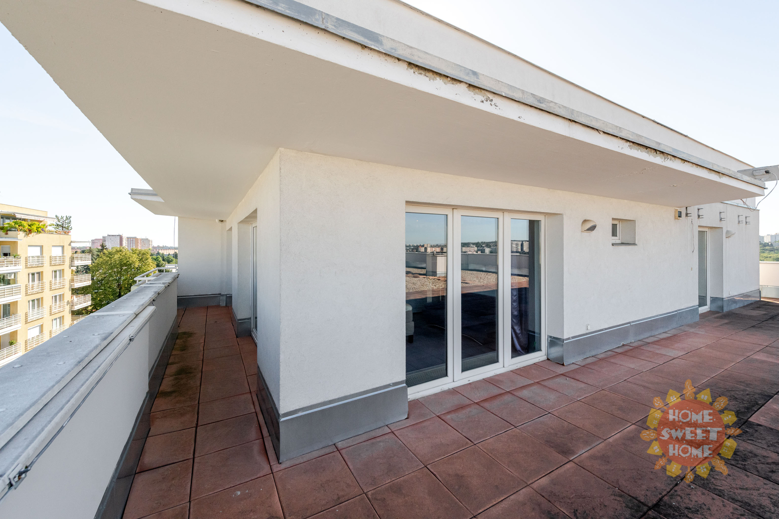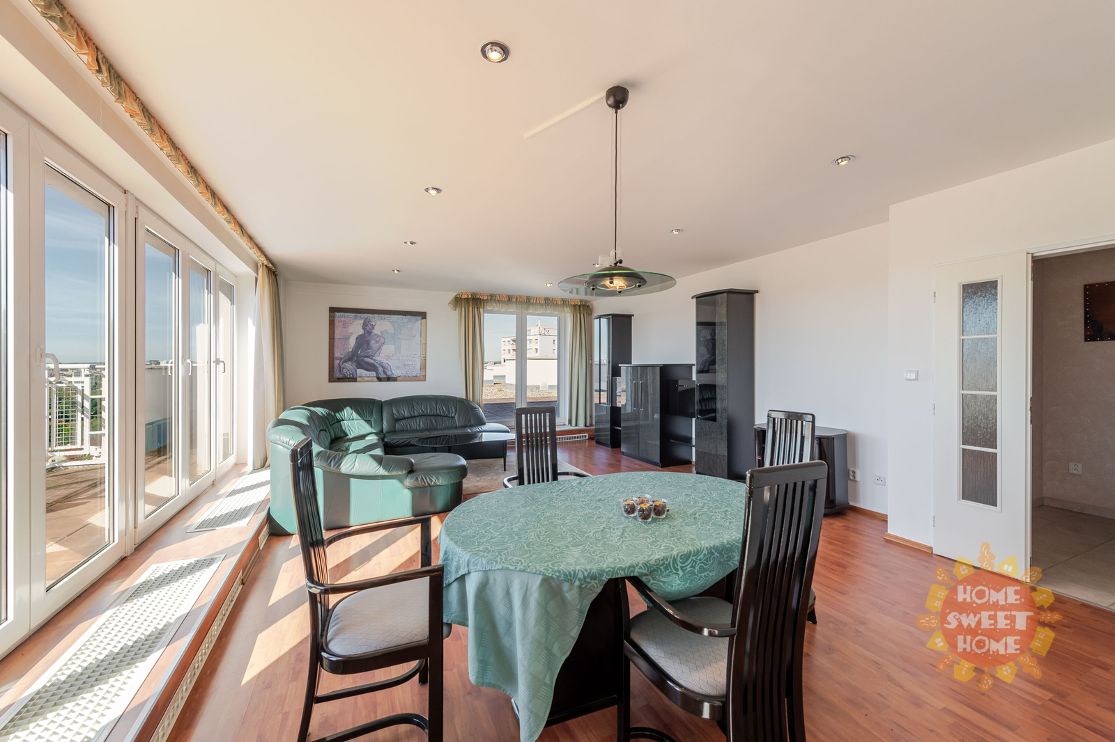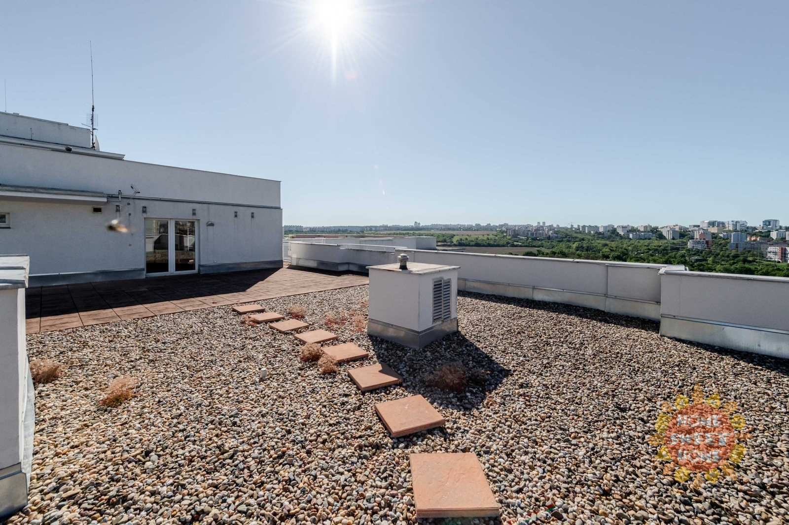 We offer for rent a partially furnished 4+1 apartment with an area of 150 m² with a generous private terrace (150 m²) on the roof of the building, which offers beautiful views of the surrounding area of Záběhlice. The apartment is located on the 6th floor of a new building with an elevator on Hyacintová Street. Security is provided by daily security guards, creating a safe and peaceful atmosphere for families.