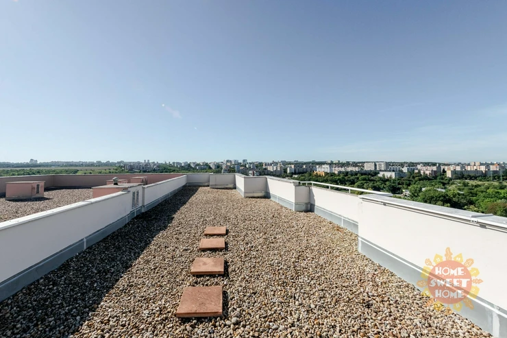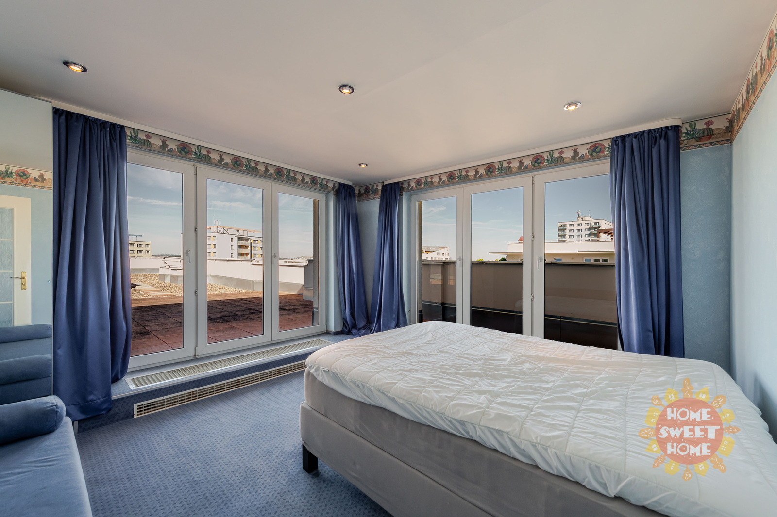 The apartment is designed to meet the needs of families. The apartment is partially furnished and consists of an entrance hall, two spacious bedrooms and one children's room, which can be converted into a study, two bathrooms with toilets (shower and bathtub), a spacious living room with French windows and an equipped kitchenette (dishwasher, built-in refrigerator with freezer, electric All rooms have their own access to a large roof terrace with beautiful panoramic views of the surrounding area. The terrace, with an incredible area of 150m2, provides an ideal place for family gatherings or barbecues in the warm months.