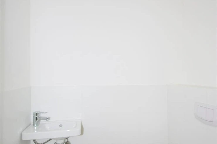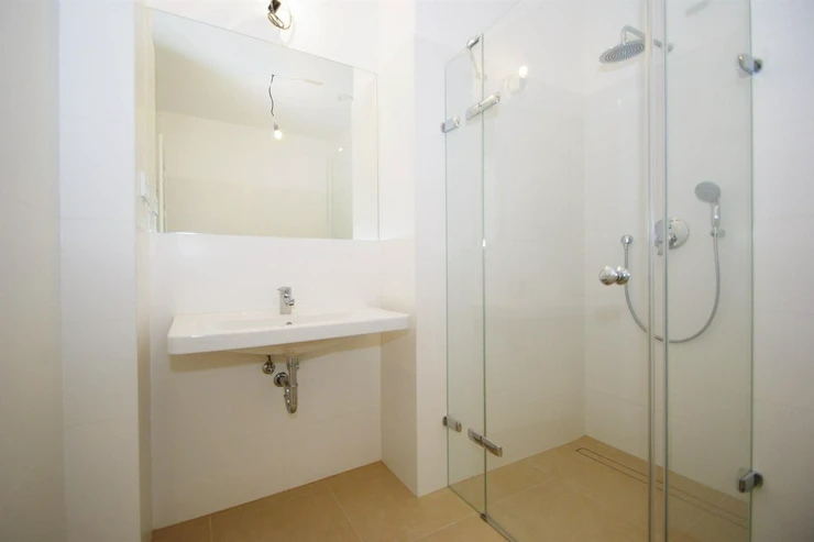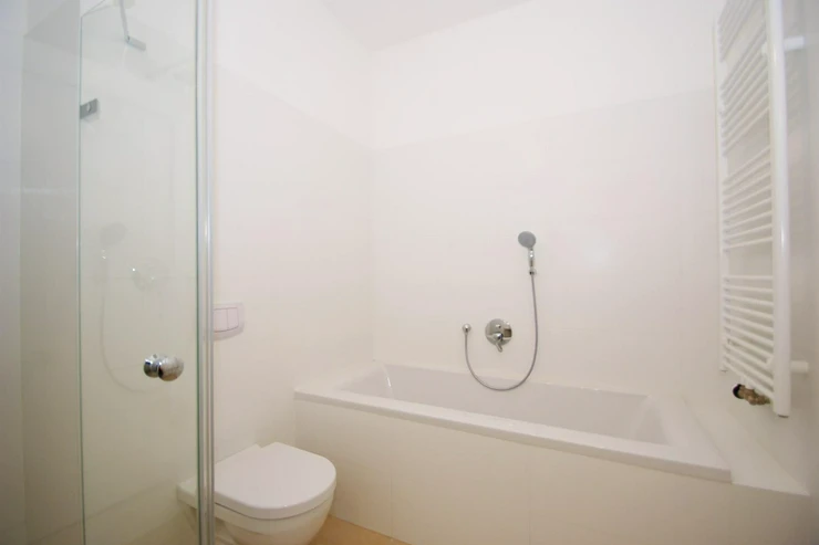 The interior of the apartment is unfurnished and layout-wise offers an entrance hall, a bright living room with a fully equipped kitchen unit (dishwasher, hob, oven, extractor hood, fridge with freezer), two separate bedrooms, a modern bathroom (bathtub, shower, toilet), an additional separate toilet, and a utility room with a washing machine and dryer. The cellar at disposal.
