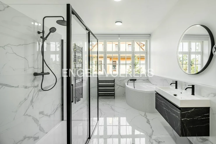 Beautiful bathroom with shower, bathtub, and toilet. There is also a separate toilet. In the utility room, you will find a gas boiler. The apartment is partially furnished; additional furnishings can be provided upon agreement. It is possible to use the shared garden. Parking is available on the property behind a remote-controlled gate for 1-2 cars.