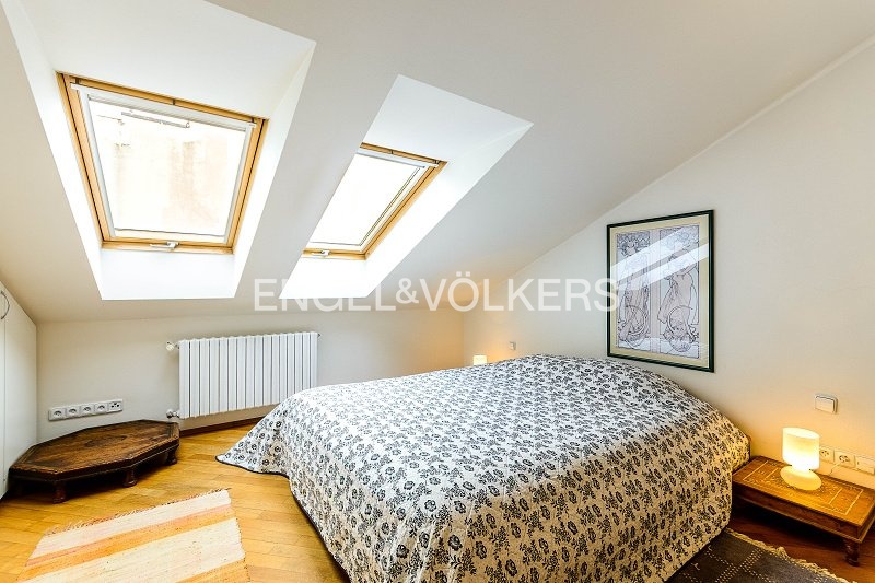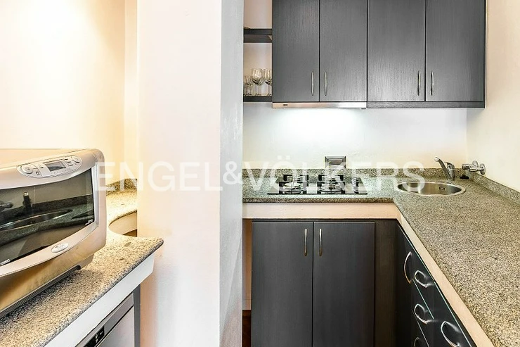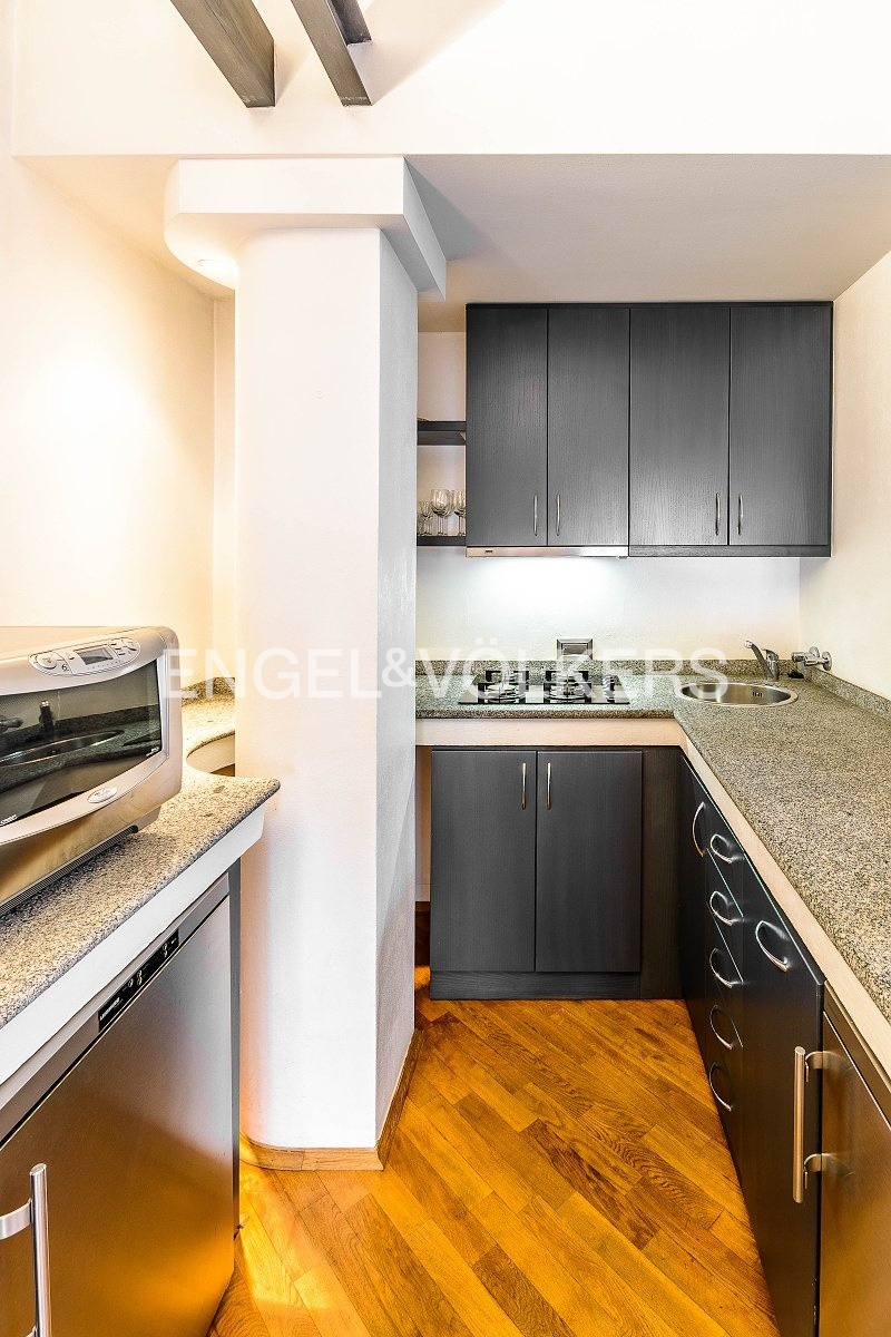 The apartment is located on the top floor of the apartment building and is fully furnished with designer furniture. The central room is a spacious and bright living room with a kitchenette equipped with all appliances. The terrace is accessible from the living room and provides plenty of privacy.