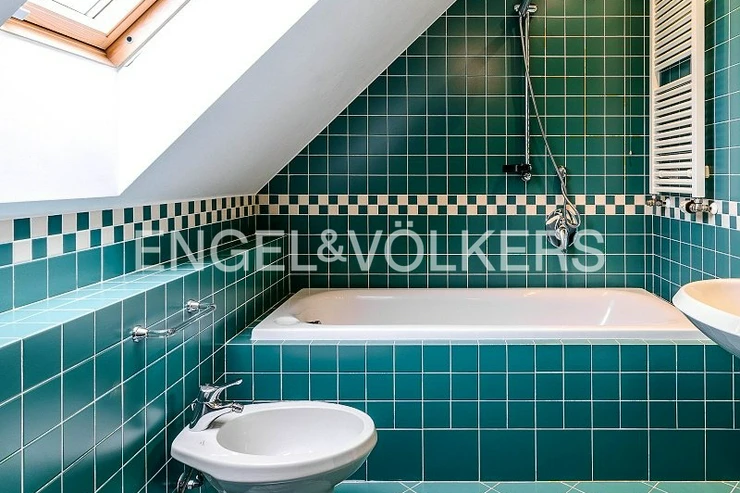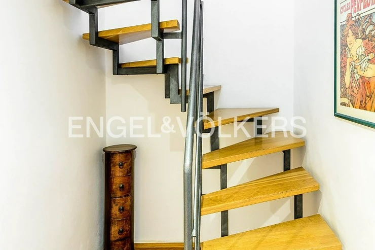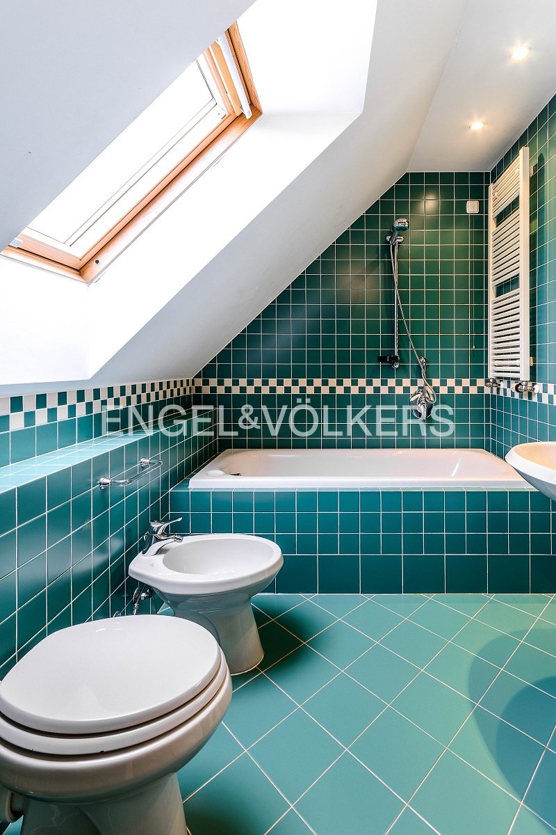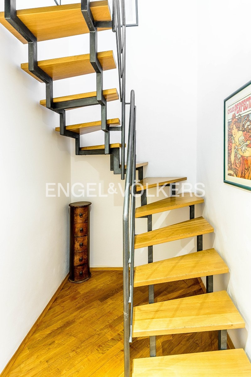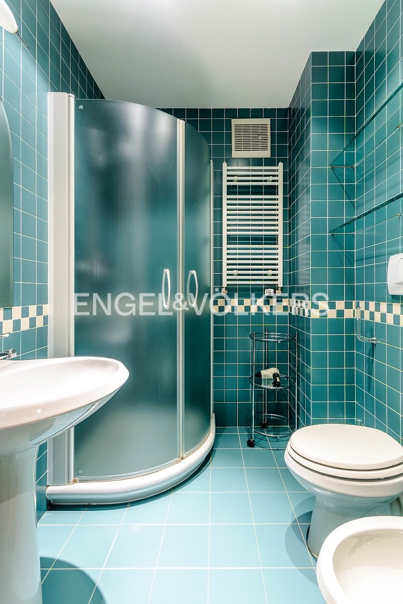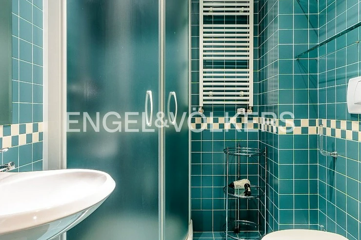 The renovation preserved all of the original decorative and architectural elements of the building and apartment. Only high-quality materials were used in the renovation, such as bathroom tiles, parquet flooring, and sanitary fixtures.