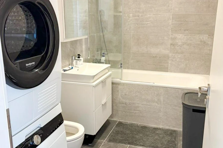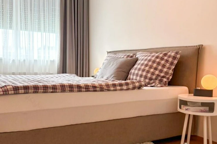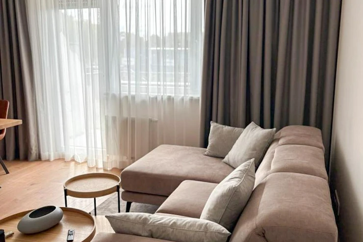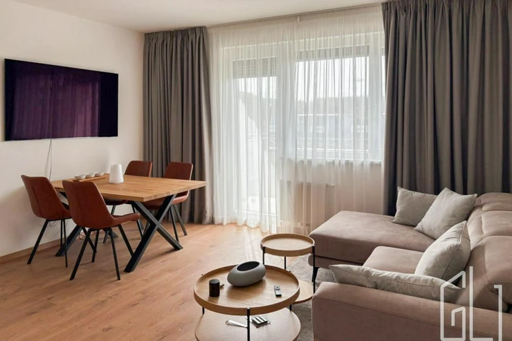 Byt je plně zařízený luxusním nábytkem vysoké kvality. Kuchyňská linka je vybavena spotřebiči - lednice, trouba, varná deska, kávovar, konvice, příbory a talíře. Koupelna disponuje sprchovou vanou, toaletou, pračkou a sušičkou. K dispozici je dostatek úložného prostoru v chodbě, šatně v ložnici a technické místnosti. Velká okna s nastavitelnými zatemňovacími závěsy a venkovními žaluziemi zajišťují dostatek světla a možnost úplného zatemnění místnosti.